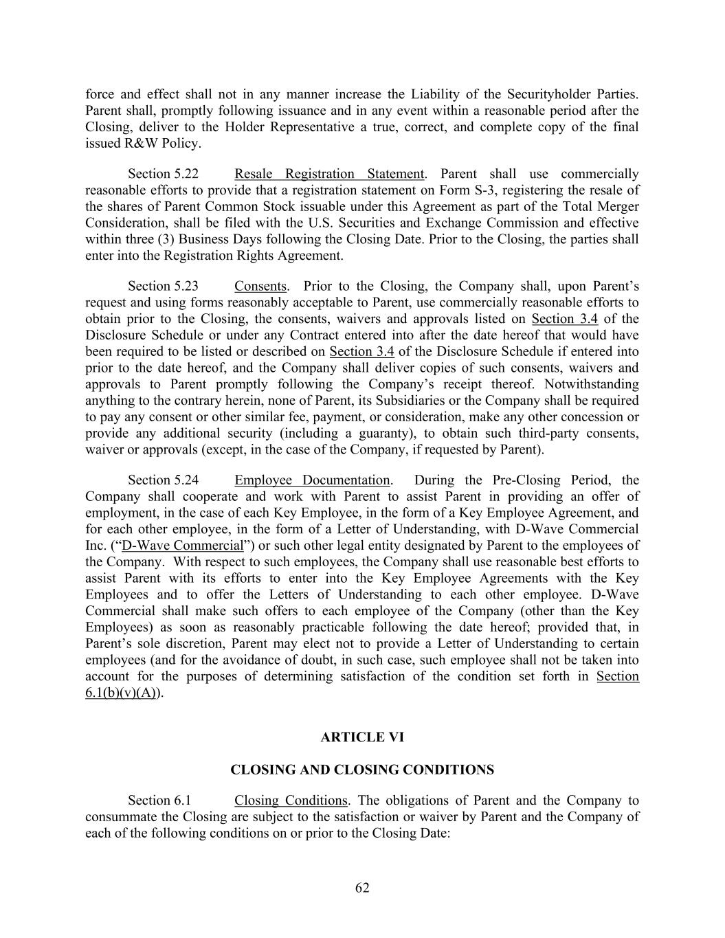62 force and effect shall not in any manner increase the Liability of the Securityholder Parties. Parent shall, promptly following issuance and in any event within a reasonable period after the Closing, deliver to the Holder Representative a true, correct, and complete copy of the final issued R&W Policy. Section 5.22 Resale Registration Statement. Parent shall use commercially reasonable efforts to provide that a registration statement on Form S-3, registering the resale of the shares of Parent Common Stock issuable under this Agreement as part of the Total Merger Consideration, shall be filed with the U.S. Securities and Exchange Commission and effective within three (3) Business Days following the Closing Date. Prior to the Closing, the parties shall enter into the Registration Rights Agreement. Section 5.23 Consents. Prior to the Closing, the Company shall, upon Parent’s request and using forms reasonably acceptable to Parent, use commercially reasonable efforts to obtain prior to the Closing, the consents, waivers and approvals listed on Section 3.4 of the Disclosure Schedule or under any Contract entered into after the date hereof that would have been required to be listed or described on Section 3.4 of the Disclosure Schedule if entered into prior to the date hereof, and the Company shall deliver copies of such consents, waivers and approvals to Parent promptly following the Company’s receipt thereof. Notwithstanding anything to the contrary herein, none of Parent, its Subsidiaries or the Company shall be required to pay any consent or other similar fee, payment, or consideration, make any other concession or provide any additional security (including a guaranty), to obtain such third-party consents, waiver or approvals (except, in the case of the Company, if requested by Parent). Section 5.24 Employee Documentation. During the Pre-Closing Period, the Company shall cooperate and work with Parent to assist Parent in providing an offer of employment, in the case of each Key Employee, in the form of a Key Employee Agreement, and for each other employee, in the form of a Letter of Understanding, with D-Wave Commercial Inc. (“D-Wave Commercial”) or such other legal entity designated by Parent to the employees of the Company. With respect to such employees, the Company shall use reasonable best efforts to assist Parent with its efforts to enter into the Key Employee Agreements with the Key Employees and to offer the Letters of Understanding to each other employee. D-Wave Commercial shall make such offers to each employee of the Company (other than the Key Employees) as soon as reasonably practicable following the date hereof; provided that, in Parent’s sole discretion, Parent may elect not to provide a Letter of Understanding to certain employees (and for the avoidance of doubt, in such case, such employee shall not be taken into account for the purposes of determining satisfaction of the condition set forth in Section 6.1(b)(v)(A)). ARTICLE VI CLOSING AND CLOSING CONDITIONS Section 6.1 Closing Conditions. The obligations of Parent and the Company to consummate the Closing are subject to the satisfaction or waiver by Parent and the Company of each of the following conditions on or prior to the Closing Date: