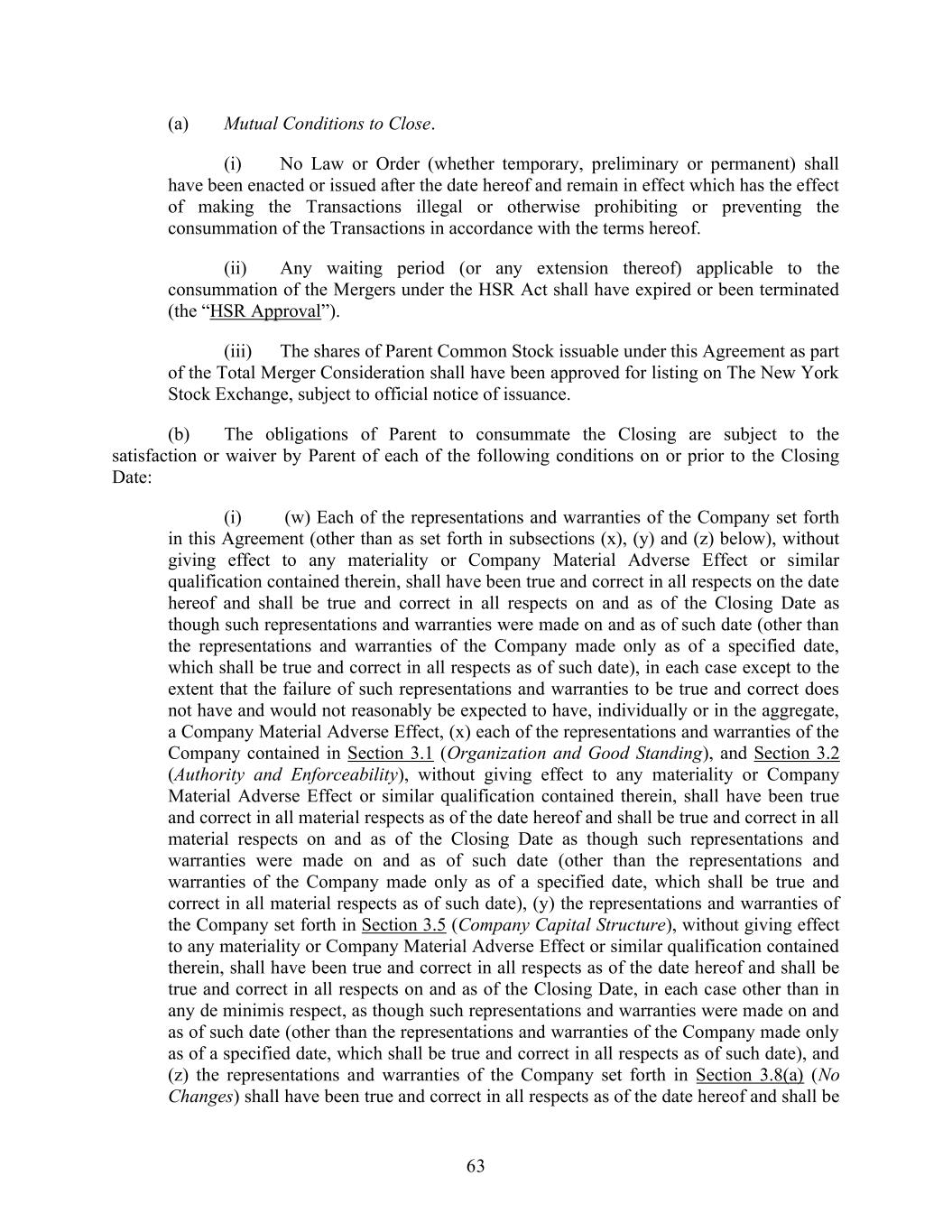 63 (a) Mutual Conditions to Close. (i) No Law or Order (whether temporary, preliminary or permanent) shall have been enacted or issued after the date hereof and remain in effect which has the effect of making the Transactions illegal or otherwise prohibiting or preventing the consummation of the Transactions in accordance with the terms hereof. (ii) Any waiting period (or any extension thereof) applicable to the consummation of the Mergers under the HSR Act shall have expired or been terminated (the “HSR Approval”). (iii) The shares of Parent Common Stock issuable under this Agreement as part of the Total Merger Consideration shall have been approved for listing on The New York Stock Exchange, subject to official notice of issuance. (b) The obligations of Parent to consummate the Closing are subject to the satisfaction or waiver by Parent of each of the following conditions on or prior to the Closing Date: (i) (w) Each of the representations and warranties of the Company set forth in this Agreement (other than as set forth in subsections (x), (y) and (z) below), without giving effect to any materiality or Company Material Adverse Effect or similar qualification contained therein, shall have been true and correct in all respects on the date hereof and shall be true and correct in all respects on and as of the Closing Date as though such representations and warranties were made on and as of such date (other than the representations and warranties of the Company made only as of a specified date, which shall be true and correct in all respects as of such date), in each case except to the extent that the failure of such representations and warranties to be true and correct does not have and would not reasonably be expected to have, individually or in the aggregate, a Company Material Adverse Effect, (x) each of the representations and warranties of the Company contained in Section 3.1 (Organization and Good Standing), and Section 3.2 (Authority and Enforceability), without giving effect to any materiality or Company Material Adverse Effect or similar qualification contained therein, shall have been true and correct in all material respects as of the date hereof and shall be true and correct in all material respects on and as of the Closing Date as though such representations and warranties were made on and as of such date (other than the representations and warranties of the Company made only as of a specified date, which shall be true and correct in all material respects as of such date), (y) the representations and warranties of the Company set forth in Section 3.5 (Company Capital Structure), without giving effect to any materiality or Company Material Adverse Effect or similar qualification contained therein, shall have been true and correct in all respects as of the date hereof and shall be true and correct in all respects on and as of the Closing Date, in each case other than in any de minimis respect, as though such representations and warranties were made on and as of such date (other than the representations and warranties of the Company made only as of a specified date, which shall be true and correct in all respects as of such date), and (z) the representations and warranties of the Company set forth in Section 3.8(a) (No Changes) shall have been true and correct in all respects as of the date hereof and shall be