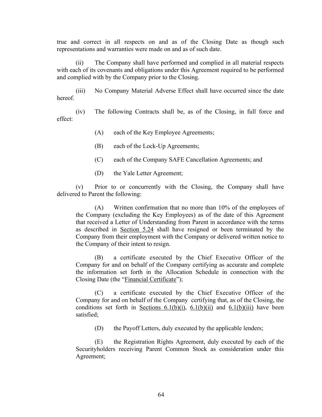 64 true and correct in all respects on and as of the Closing Date as though such representations and warranties were made on and as of such date. (ii) The Company shall have performed and complied in all material respects with each of its covenants and obligations under this Agreement required to be performed and complied with by the Company prior to the Closing. (iii) No Company Material Adverse Effect shall have occurred since the date hereof. (iv) The following Contracts shall be, as of the Closing, in full force and effect: (A) each of the Key Employee Agreements; (B) each of the Lock-Up Agreements; (C) each of the Company SAFE Cancellation Agreements; and (D) the Yale Letter Agreement; (v) Prior to or concurrently with the Closing, the Company shall have delivered to Parent the following: (A) Written confirmation that no more than 10% of the employees of the Company (excluding the Key Employees) as of the date of this Agreement that received a Letter of Understanding from Parent in accordance with the terms as described in Section 5.24 shall have resigned or been terminated by the Company from their employment with the Company or delivered written notice to the Company of their intent to resign. (B) a certificate executed by the Chief Executive Officer of the Company for and on behalf of the Company certifying as accurate and complete the information set forth in the Allocation Schedule in connection with the Closing Date (the “Financial Certificate”); (C) a certificate executed by the Chief Executive Officer of the Company for and on behalf of the Company certifying that, as of the Closing, the conditions set forth in Sections 6.1(b)(i), 6.1(b)(ii) and 6.1(b)(iii) have been satisfied; (D) the Payoff Letters, duly executed by the applicable lenders; (E) the Registration Rights Agreement, duly executed by each of the Securityholders receiving Parent Common Stock as consideration under this Agreement;