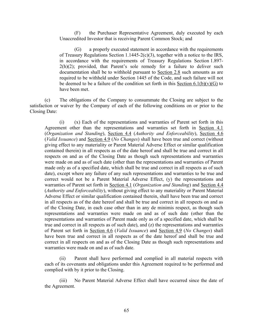 65 (F) the Purchaser Representative Agreement, duly executed by each Unaccredited Investor that is receiving Parent Common Stock; and (G) a properly executed statement in accordance with the requirements of Treasury Regulations Section 1.1445-2(c)(3), together with a notice to the IRS, in accordance with the requirements of Treasury Regulations Section 1.897- 2(h)(2); provided, that Parent’s sole remedy for a failure to deliver such documentation shall be to withhold pursuant to Section 2.8 such amounts as are required to be withheld under Section 1445 of the Code, and such failure will not be deemed to be a failure of the condition set forth in this Section 6.1(b)(v)(G) to have been met. (c) The obligations of the Company to consummate the Closing are subject to the satisfaction or waiver by the Company of each of the following conditions on or prior to the Closing Date: (i) (x) Each of the representations and warranties of Parent set forth in this Agreement other than the representations and warranties set forth in Section 4.1 (Organization and Standing), Section 4.4 (Authority and Enforceability), Section 4.6 (Valid Issuance) and Section 4.9 (No Changes) shall have been true and correct (without giving effect to any materiality or Parent Material Adverse Effect or similar qualification contained therein) in all respects as of the date hereof and shall be true and correct in all respects on and as of the Closing Date as though such representations and warranties were made on and as of such date (other than the representations and warranties of Parent made only as of a specified date, which shall be true and correct in all respects as of such date), except where any failure of any such representations and warranties to be true and correct would not be a Parent Material Adverse Effect, (y) the representations and warranties of Parent set forth in Section 4.1 (Organization and Standing) and Section 4.4 (Authority and Enforceability), without giving effect to any materiality or Parent Material Adverse Effect or similar qualification contained therein, shall have been true and correct in all respects as of the date hereof and shall be true and correct in all respects on and as of the Closing Date, in each case other than in any de minimis respect, as though such representations and warranties were made on and as of such date (other than the representations and warranties of Parent made only as of a specified date, which shall be true and correct in all respects as of such date), and (z) the representations and warranties of Parent set forth in Section 4.6 (Valid Issuance) and Section 4.9 (No Changes) shall have been true and correct in all respects as of the date hereof and shall be true and correct in all respects on and as of the Closing Date as though such representations and warranties were made on and as of such date. (ii) Parent shall have performed and complied in all material respects with each of its covenants and obligations under this Agreement required to be performed and complied with by it prior to the Closing. (iii) No Parent Material Adverse Effect shall have occurred since the date of the Agreement.
