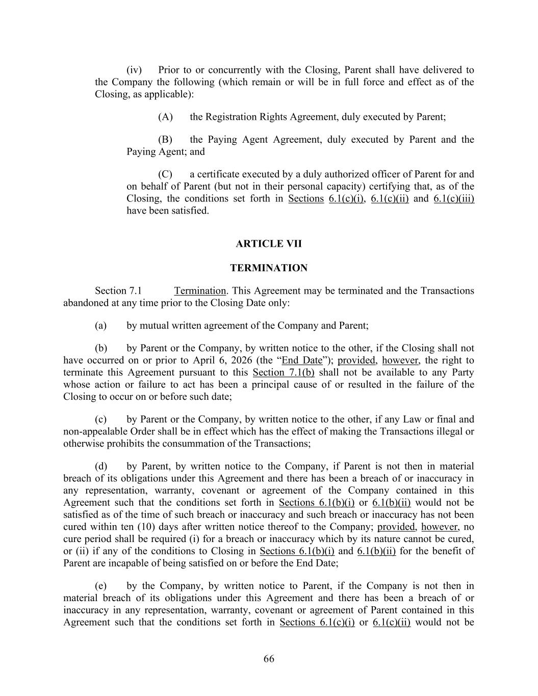 66 (iv) Prior to or concurrently with the Closing, Parent shall have delivered to the Company the following (which remain or will be in full force and effect as of the Closing, as applicable): (A) the Registration Rights Agreement, duly executed by Parent; (B) the Paying Agent Agreement, duly executed by Parent and the Paying Agent; and (C) a certificate executed by a duly authorized officer of Parent for and on behalf of Parent (but not in their personal capacity) certifying that, as of the Closing, the conditions set forth in Sections 6.1(c)(i), 6.1(c)(ii) and 6.1(c)(iii) have been satisfied. ARTICLE VII TERMINATION Section 7.1 Termination. This Agreement may be terminated and the Transactions abandoned at any time prior to the Closing Date only: (a) by mutual written agreement of the Company and Parent; (b) by Parent or the Company, by written notice to the other, if the Closing shall not have occurred on or prior to April 6, 2026 (the “End Date”); provided, however, the right to terminate this Agreement pursuant to this Section 7.1(b) shall not be available to any Party whose action or failure to act has been a principal cause of or resulted in the failure of the Closing to occur on or before such date; (c) by Parent or the Company, by written notice to the other, if any Law or final and non-appealable Order shall be in effect which has the effect of making the Transactions illegal or otherwise prohibits the consummation of the Transactions; (d) by Parent, by written notice to the Company, if Parent is not then in material breach of its obligations under this Agreement and there has been a breach of or inaccuracy in any representation, warranty, covenant or agreement of the Company contained in this Agreement such that the conditions set forth in Sections 6.1(b)(i) or 6.1(b)(ii) would not be satisfied as of the time of such breach or inaccuracy and such breach or inaccuracy has not been cured within ten (10) days after written notice thereof to the Company; provided, however, no cure period shall be required (i) for a breach or inaccuracy which by its nature cannot be cured, or (ii) if any of the conditions to Closing in Sections 6.1(b)(i) and 6.1(b)(ii) for the benefit of Parent are incapable of being satisfied on or before the End Date; (e) by the Company, by written notice to Parent, if the Company is not then in material breach of its obligations under this Agreement and there has been a breach of or inaccuracy in any representation, warranty, covenant or agreement of Parent contained in this Agreement such that the conditions set forth in Sections 6.1(c)(i) or 6.1(c)(ii) would not be