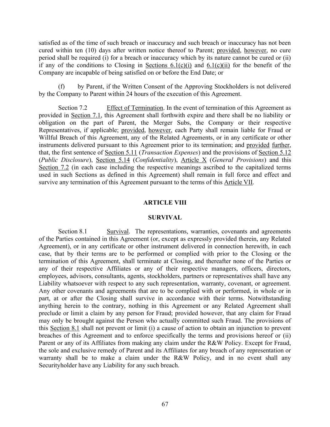 67 satisfied as of the time of such breach or inaccuracy and such breach or inaccuracy has not been cured within ten (10) days after written notice thereof to Parent; provided, however, no cure period shall be required (i) for a breach or inaccuracy which by its nature cannot be cured or (ii) if any of the conditions to Closing in Sections 6.1(c)(i) and 6.1(c)(ii) for the benefit of the Company are incapable of being satisfied on or before the End Date; or (f) by Parent, if the Written Consent of the Approving Stockholders is not delivered by the Company to Parent within 24 hours of the execution of this Agreement. Section 7.2 Effect of Termination. In the event of termination of this Agreement as provided in Section 7.1, this Agreement shall forthwith expire and there shall be no liability or obligation on the part of Parent, the Merger Subs, the Company or their respective Representatives, if applicable; provided, however, each Party shall remain liable for Fraud or Willful Breach of this Agreement, any of the Related Agreements, or in any certificate or other instruments delivered pursuant to this Agreement prior to its termination; and provided further, that, the first sentence of Section 5.11 (Transaction Expenses) and the provisions of Section 5.12 (Public Disclosure), Section 5.14 (Confidentiality), Article X (General Provisions) and this Section 7.2 (in each case including the respective meanings ascribed to the capitalized terms used in such Sections as defined in this Agreement) shall remain in full force and effect and survive any termination of this Agreement pursuant to the terms of this Article VII. ARTICLE VIII SURVIVAL Section 8.1 Survival. The representations, warranties, covenants and agreements of the Parties contained in this Agreement (or, except as expressly provided therein, any Related Agreement), or in any certificate or other instrument delivered in connection herewith, in each case, that by their terms are to be performed or complied with prior to the Closing or the termination of this Agreement, shall terminate at Closing, and thereafter none of the Parties or any of their respective Affiliates or any of their respective managers, officers, directors, employees, advisors, consultants, agents, stockholders, partners or representatives shall have any Liability whatsoever with respect to any such representation, warranty, covenant, or agreement. Any other covenants and agreements that are to be complied with or performed, in whole or in part, at or after the Closing shall survive in accordance with their terms. Notwithstanding anything herein to the contrary, nothing in this Agreement or any Related Agreement shall preclude or limit a claim by any person for Fraud; provided however, that any claim for Fraud may only be brought against the Person who actually committed such Fraud. The provisions of this Section 8.1 shall not prevent or limit (i) a cause of action to obtain an injunction to prevent breaches of this Agreement and to enforce specifically the terms and provisions hereof or (ii) Parent or any of its Affiliates from making any claim under the R&W Policy. Except for Fraud, the sole and exclusive remedy of Parent and its Affiliates for any breach of any representation or warranty shall be to make a claim under the R&W Policy, and in no event shall any Securityholder have any Liability for any such breach.