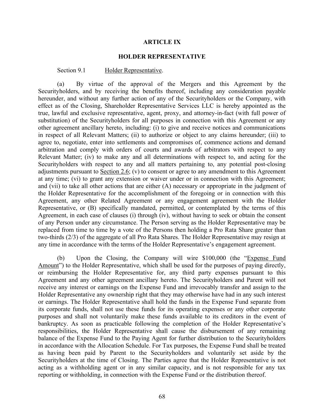 68 ARTICLE IX HOLDER REPRESENTATIVE Section 9.1 Holder Representative. (a) By virtue of the approval of the Mergers and this Agreement by the Securityholders, and by receiving the benefits thereof, including any consideration payable hereunder, and without any further action of any of the Securityholders or the Company, with effect as of the Closing, Shareholder Representative Services LLC is hereby appointed as the true, lawful and exclusive representative, agent, proxy, and attorney-in-fact (with full power of substitution) of the Securityholders for all purposes in connection with this Agreement or any other agreement ancillary hereto, including: (i) to give and receive notices and communications in respect of all Relevant Matters; (ii) to authorize or object to any claims hereunder; (iii) to agree to, negotiate, enter into settlements and compromises of, commence actions and demand arbitration and comply with orders of courts and awards of arbitrators with respect to any Relevant Matter; (iv) to make any and all determinations with respect to, and acting for the Securityholders with respect to any and all matters pertaining to, any potential post-closing adjustments pursuant to Section 2.6; (v) to consent or agree to any amendment to this Agreement at any time; (vi) to grant any extension or waiver under or in connection with this Agreement; and (vii) to take all other actions that are either (A) necessary or appropriate in the judgment of the Holder Representative for the accomplishment of the foregoing or in connection with this Agreement, any other Related Agreement or any engagement agreement with the Holder Representative, or (B) specifically mandated, permitted, or contemplated by the terms of this Agreement, in each case of clauses (i) through (iv), without having to seek or obtain the consent of any Person under any circumstance. The Person serving as the Holder Representative may be replaced from time to time by a vote of the Persons then holding a Pro Rata Share greater than two-thirds (2/3) of the aggregate of all Pro Rata Shares. The Holder Representative may resign at any time in accordance with the terms of the Holder Representative’s engagement agreement. (b) Upon the Closing, the Company will wire $100,000 (the “Expense Fund Amount”) to the Holder Representative, which shall be used for the purposes of paying directly, or reimbursing the Holder Representative for, any third party expenses pursuant to this Agreement and any other agreement ancillary hereto. The Securityholders and Parent will not receive any interest or earnings on the Expense Fund and irrevocably transfer and assign to the Holder Representative any ownership right that they may otherwise have had in any such interest or earnings. The Holder Representative shall hold the funds in the Expense Fund separate from its corporate funds, shall not use these funds for its operating expenses or any other corporate purposes and shall not voluntarily make these funds available to its creditors in the event of bankruptcy. As soon as practicable following the completion of the Holder Representative’s responsibilities, the Holder Representative shall cause the disbursement of any remaining balance of the Expense Fund to the Paying Agent for further distribution to the Securityholders in accordance with the Allocation Schedule. For Tax purposes, the Expense Fund shall be treated as having been paid by Parent to the Securityholders and voluntarily set aside by the Securityholders at the time of Closing. The Parties agree that the Holder Representative is not acting as a withholding agent or in any similar capacity, and is not responsible for any tax reporting or withholding, in connection with the Expense Fund or the distribution thereof.