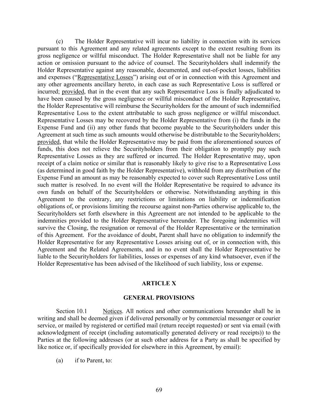69 (c) The Holder Representative will incur no liability in connection with its services pursuant to this Agreement and any related agreements except to the extent resulting from its gross negligence or willful misconduct. The Holder Representative shall not be liable for any action or omission pursuant to the advice of counsel. The Securityholders shall indemnify the Holder Representative against any reasonable, documented, and out-of-pocket losses, liabilities and expenses (“Representative Losses”) arising out of or in connection with this Agreement and any other agreements ancillary hereto, in each case as such Representative Loss is suffered or incurred; provided, that in the event that any such Representative Loss is finally adjudicated to have been caused by the gross negligence or willful misconduct of the Holder Representative, the Holder Representative will reimburse the Securityholders for the amount of such indemnified Representative Loss to the extent attributable to such gross negligence or willful misconduct. Representative Losses may be recovered by the Holder Representative from (i) the funds in the Expense Fund and (ii) any other funds that become payable to the Securityholders under this Agreement at such time as such amounts would otherwise be distributable to the Securityholders; provided, that while the Holder Representative may be paid from the aforementioned sources of funds, this does not relieve the Securityholders from their obligation to promptly pay such Representative Losses as they are suffered or incurred. The Holder Representative may, upon receipt of a claim notice or similar that is reasonably likely to give rise to a Representative Loss (as determined in good faith by the Holder Representative), withhold from any distribution of the Expense Fund an amount as may be reasonably expected to cover such Representative Loss until such matter is resolved. In no event will the Holder Representative be required to advance its own funds on behalf of the Securityholders or otherwise. Notwithstanding anything in this Agreement to the contrary, any restrictions or limitations on liability or indemnification obligations of, or provisions limiting the recourse against non-Parties otherwise applicable to, the Securityholders set forth elsewhere in this Agreement are not intended to be applicable to the indemnities provided to the Holder Representative hereunder. The foregoing indemnities will survive the Closing, the resignation or removal of the Holder Representative or the termination of this Agreement. For the avoidance of doubt, Parent shall have no obligation to indemnify the Holder Representative for any Representative Losses arising out of, or in connection with, this Agreement and the Related Agreements, and in no event shall the Holder Representative be liable to the Securityholders for liabilities, losses or expenses of any kind whatsoever, even if the Holder Representative has been advised of the likelihood of such liability, loss or expense. ARTICLE X GENERAL PROVISIONS Section 10.1 Notices. All notices and other communications hereunder shall be in writing and shall be deemed given if delivered personally or by commercial messenger or courier service, or mailed by registered or certified mail (return receipt requested) or sent via email (with acknowledgment of receipt (including automatically generated delivery or read receipts)) to the Parties at the following addresses (or at such other address for a Party as shall be specified by like notice or, if specifically provided for elsewhere in this Agreement, by email): (a) if to Parent, to: