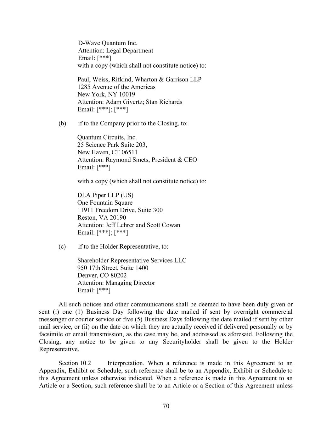 70 D-Wave Quantum Inc. Attention: Legal Department Email: [***] with a copy (which shall not constitute notice) to: Paul, Weiss, Rifkind, Wharton & Garrison LLP 1285 Avenue of the Americas New York, NY 10019 Attention: Adam Givertz; Stan Richards Email: [***]; [***] (b) if to the Company prior to the Closing, to: Quantum Circuits, Inc. 25 Science Park Suite 203, New Haven, CT 06511 Attention: Raymond Smets, President & CEO Email: [***] with a copy (which shall not constitute notice) to: DLA Piper LLP (US) One Fountain Square 11911 Freedom Drive, Suite 300 Reston, VA 20190 Attention: Jeff Lehrer and Scott Cowan Email: [***]; [***] (c) if to the Holder Representative, to: Shareholder Representative Services LLC 950 17th Street, Suite 1400 Denver, CO 80202 Attention: Managing Director Email: [***] All such notices and other communications shall be deemed to have been duly given or sent (i) one (1) Business Day following the date mailed if sent by overnight commercial messenger or courier service or five (5) Business Days following the date mailed if sent by other mail service, or (ii) on the date on which they are actually received if delivered personally or by facsimile or email transmission, as the case may be, and addressed as aforesaid. Following the Closing, any notice to be given to any Securityholder shall be given to the Holder Representative. Section 10.2 Interpretation. When a reference is made in this Agreement to an Appendix, Exhibit or Schedule, such reference shall be to an Appendix, Exhibit or Schedule to this Agreement unless otherwise indicated. When a reference is made in this Agreement to an Article or a Section, such reference shall be to an Article or a Section of this Agreement unless