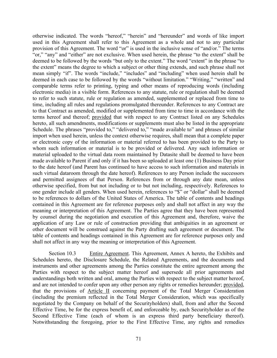 71 otherwise indicated. The words “hereof,” “herein” and “hereunder” and words of like import used in this Agreement shall refer to this Agreement as a whole and not to any particular provision of this Agreement. The word “or” is used in the inclusive sense of “and/or.” The terms “or,” “any” and “either” are not exclusive. When used herein, the phrase “to the extent” shall be deemed to be followed by the words “but only to the extent.” The word “extent” in the phrase “to the extent” means the degree to which a subject or other thing extends, and such phrase shall not mean simply “if”. The words “include,” “includes” and “including” when used herein shall be deemed in each case to be followed by the words “without limitation.” “Writing,” “written” and comparable terms refer to printing, typing and other means of reproducing words (including electronic media) in a visible form. References to any statute, rule or regulation shall be deemed to refer to such statute, rule or regulation as amended, supplemented or replaced from time to time, including all rules and regulations promulgated thereunder. References to any Contract are to that Contract as amended, modified or supplemented from time to time in accordance with the terms hereof and thereof; provided that with respect to any Contract listed on any Schedules hereto, all such amendments, modifications or supplements must also be listed in the appropriate Schedule. The phrases “provided to,” “delivered to,” “made available to” and phrases of similar import when used herein, unless the context otherwise requires, shall mean that a complete paper or electronic copy of the information or material referred to has been provided to the Party to whom such information or material is to be provided or delivered. Any such information or material uploaded to the virtual data room maintained by Datasite shall be deemed to have been made available to Parent if and only if it has been so uploaded at least one (1) Business Day prior to the date hereof (and Parent has continued to have access to such information and materials in such virtual dataroom through the date hereof). References to any Person include the successors and permitted assignees of that Person. References from or through any date mean, unless otherwise specified, from but not including or to but not including, respectively. References to one gender include all genders. When used herein, references to “$” or “dollar” shall be deemed to be references to dollars of the United States of America. The table of contents and headings contained in this Agreement are for reference purposes only and shall not affect in any way the meaning or interpretation of this Agreement. The Parties agree that they have been represented by counsel during the negotiation and execution of this Agreement and, therefore, waive the application of any Law or rule of construction providing that ambiguities in an agreement or other document will be construed against the Party drafting such agreement or document. The table of contents and headings contained in this Agreement are for reference purposes only and shall not affect in any way the meaning or interpretation of this Agreement. Section 10.3 Entire Agreement. This Agreement, Annex A hereto, the Exhibits and Schedules hereto, the Disclosure Schedule, the Related Agreements, and the documents and instruments and other agreements among the Parties constitute the entire agreement among the Parties with respect to the subject matter hereof and supersede all prior agreements and understandings both written and oral, among the Parties with respect to the subject matter hereof, and are not intended to confer upon any other person any rights or remedies hereunder; provided, that the provisions of Article II concerning payment of the Total Merger Consideration (including the premium reflected in the Total Merger Consideration, which was specifically negotiated by the Company on behalf of the Securityholders) shall, from and after the Second Effective Time, be for the express benefit of, and enforceable by, each Securityholder as of the Second Effective Time (each of whom is an express third party beneficiary thereof). Notwithstanding the foregoing, prior to the First Effective Time, any rights and remedies