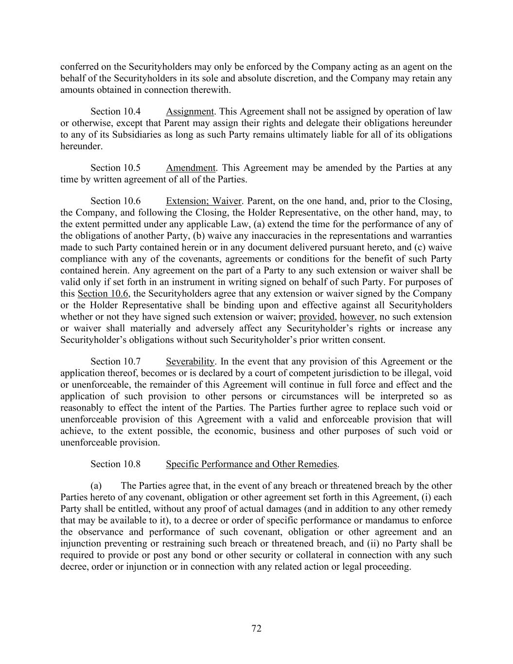 72 conferred on the Securityholders may only be enforced by the Company acting as an agent on the behalf of the Securityholders in its sole and absolute discretion, and the Company may retain any amounts obtained in connection therewith. Section 10.4 Assignment. This Agreement shall not be assigned by operation of law or otherwise, except that Parent may assign their rights and delegate their obligations hereunder to any of its Subsidiaries as long as such Party remains ultimately liable for all of its obligations hereunder. Section 10.5 Amendment. This Agreement may be amended by the Parties at any time by written agreement of all of the Parties. Section 10.6 Extension; Waiver. Parent, on the one hand, and, prior to the Closing, the Company, and following the Closing, the Holder Representative, on the other hand, may, to the extent permitted under any applicable Law, (a) extend the time for the performance of any of the obligations of another Party, (b) waive any inaccuracies in the representations and warranties made to such Party contained herein or in any document delivered pursuant hereto, and (c) waive compliance with any of the covenants, agreements or conditions for the benefit of such Party contained herein. Any agreement on the part of a Party to any such extension or waiver shall be valid only if set forth in an instrument in writing signed on behalf of such Party. For purposes of this Section 10.6, the Securityholders agree that any extension or waiver signed by the Company or the Holder Representative shall be binding upon and effective against all Securityholders whether or not they have signed such extension or waiver; provided, however, no such extension or waiver shall materially and adversely affect any Securityholder’s rights or increase any Securityholder’s obligations without such Securityholder’s prior written consent. Section 10.7 Severability. In the event that any provision of this Agreement or the application thereof, becomes or is declared by a court of competent jurisdiction to be illegal, void or unenforceable, the remainder of this Agreement will continue in full force and effect and the application of such provision to other persons or circumstances will be interpreted so as reasonably to effect the intent of the Parties. The Parties further agree to replace such void or unenforceable provision of this Agreement with a valid and enforceable provision that will achieve, to the extent possible, the economic, business and other purposes of such void or unenforceable provision. Section 10.8 Specific Performance and Other Remedies. (a) The Parties agree that, in the event of any breach or threatened breach by the other Parties hereto of any covenant, obligation or other agreement set forth in this Agreement, (i) each Party shall be entitled, without any proof of actual damages (and in addition to any other remedy that may be available to it), to a decree or order of specific performance or mandamus to enforce the observance and performance of such covenant, obligation or other agreement and an injunction preventing or restraining such breach or threatened breach, and (ii) no Party shall be required to provide or post any bond or other security or collateral in connection with any such decree, order or injunction or in connection with any related action or legal proceeding.