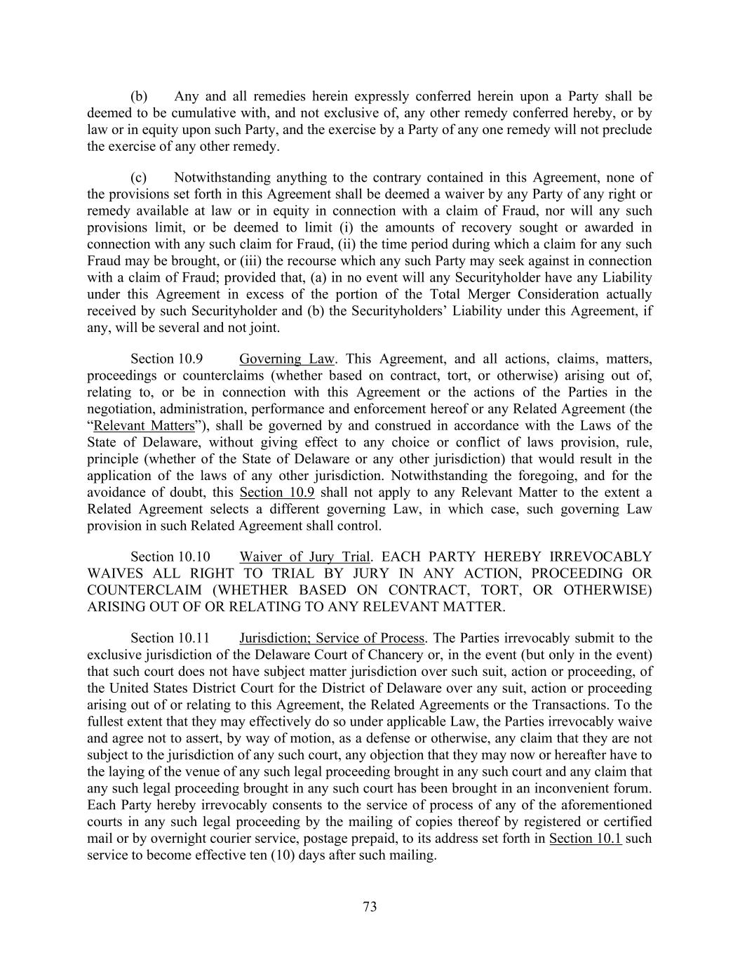 73 (b) Any and all remedies herein expressly conferred herein upon a Party shall be deemed to be cumulative with, and not exclusive of, any other remedy conferred hereby, or by law or in equity upon such Party, and the exercise by a Party of any one remedy will not preclude the exercise of any other remedy. (c) Notwithstanding anything to the contrary contained in this Agreement, none of the provisions set forth in this Agreement shall be deemed a waiver by any Party of any right or remedy available at law or in equity in connection with a claim of Fraud, nor will any such provisions limit, or be deemed to limit (i) the amounts of recovery sought or awarded in connection with any such claim for Fraud, (ii) the time period during which a claim for any such Fraud may be brought, or (iii) the recourse which any such Party may seek against in connection with a claim of Fraud; provided that, (a) in no event will any Securityholder have any Liability under this Agreement in excess of the portion of the Total Merger Consideration actually received by such Securityholder and (b) the Securityholders’ Liability under this Agreement, if any, will be several and not joint. Section 10.9 Governing Law. This Agreement, and all actions, claims, matters, proceedings or counterclaims (whether based on contract, tort, or otherwise) arising out of, relating to, or be in connection with this Agreement or the actions of the Parties in the negotiation, administration, performance and enforcement hereof or any Related Agreement (the “Relevant Matters”), shall be governed by and construed in accordance with the Laws of the State of Delaware, without giving effect to any choice or conflict of laws provision, rule, principle (whether of the State of Delaware or any other jurisdiction) that would result in the application of the laws of any other jurisdiction. Notwithstanding the foregoing, and for the avoidance of doubt, this Section 10.9 shall not apply to any Relevant Matter to the extent a Related Agreement selects a different governing Law, in which case, such governing Law provision in such Related Agreement shall control. Section 10.10 Waiver of Jury Trial. EACH PARTY HEREBY IRREVOCABLY WAIVES ALL RIGHT TO TRIAL BY JURY IN ANY ACTION, PROCEEDING OR COUNTERCLAIM (WHETHER BASED ON CONTRACT, TORT, OR OTHERWISE) ARISING OUT OF OR RELATING TO ANY RELEVANT MATTER. Section 10.11 Jurisdiction; Service of Process. The Parties irrevocably submit to the exclusive jurisdiction of the Delaware Court of Chancery or, in the event (but only in the event) that such court does not have subject matter jurisdiction over such suit, action or proceeding, of the United States District Court for the District of Delaware over any suit, action or proceeding arising out of or relating to this Agreement, the Related Agreements or the Transactions. To the fullest extent that they may effectively do so under applicable Law, the Parties irrevocably waive and agree not to assert, by way of motion, as a defense or otherwise, any claim that they are not subject to the jurisdiction of any such court, any objection that they may now or hereafter have to the laying of the venue of any such legal proceeding brought in any such court and any claim that any such legal proceeding brought in any such court has been brought in an inconvenient forum. Each Party hereby irrevocably consents to the service of process of any of the aforementioned courts in any such legal proceeding by the mailing of copies thereof by registered or certified mail or by overnight courier service, postage prepaid, to its address set forth in Section 10.1 such service to become effective ten (10) days after such mailing.
