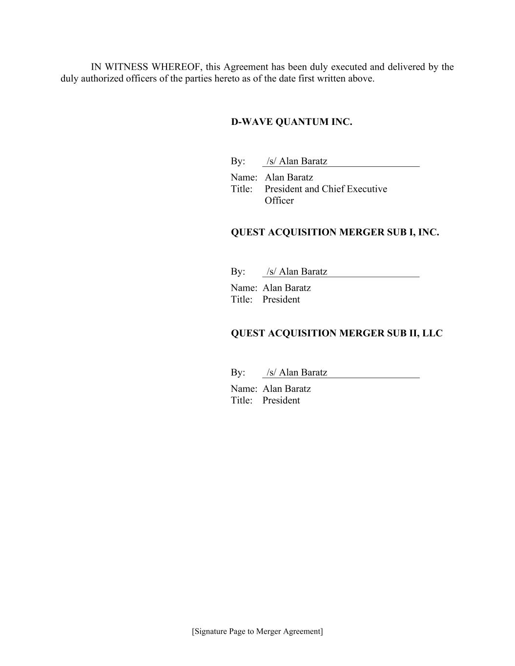 [Signature Page to Merger Agreement] IN WITNESS WHEREOF, this Agreement has been duly executed and delivered by the duly authorized officers of the parties hereto as of the date first written above. D-WAVE QUANTUM INC. By: /s/ Alan Baratz Name: Alan Baratz Title: President and Chief Executive Officer QUEST ACQUISITION MERGER SUB I, INC. By: /s/ Alan Baratz Name: Alan Baratz Title: President QUEST ACQUISITION MERGER SUB II, LLC By: /s/ Alan Baratz Name: Alan Baratz Title: President