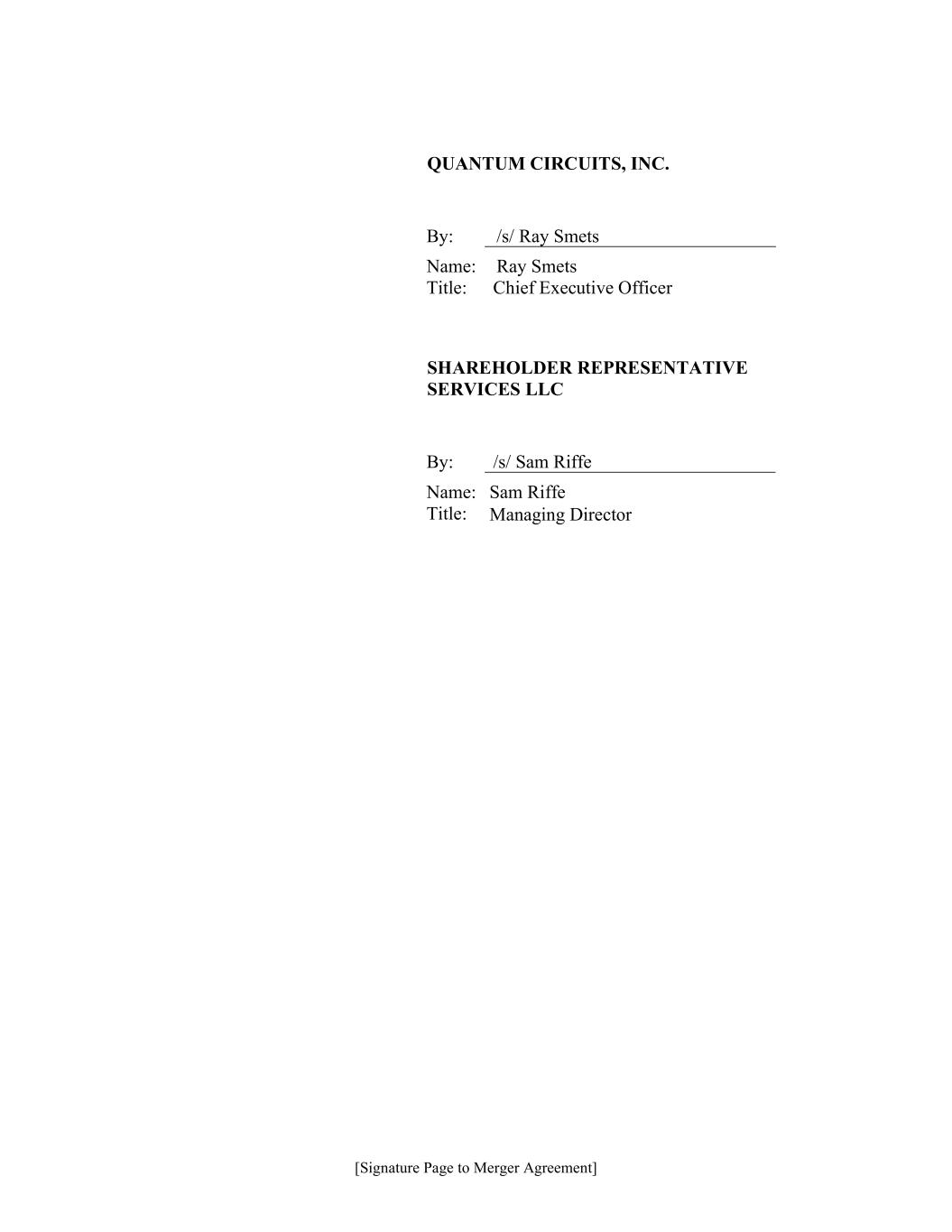 [Signature Page to Merger Agreement] QUANTUM CIRCUITS, INC. By: /s/ Ray Smets Name: Ray Smets Title: Chief Executive Officer SHAREHOLDER REPRESENTATIVE SERVICES LLC By: /s/ Sam Riffe Name: Sam Riffe Title: Managing Director