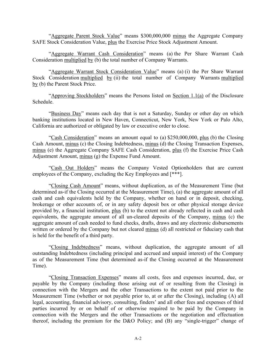 A-2 “Aggregate Parent Stock Value” means $300,000,000 minus the Aggregate Company SAFE Stock Consideration Value, plus the Exercise Price Stock Adjustment Amount. “Aggregate Warrant Cash Consideration” means (a) the Per Share Warrant Cash Consideration multiplied by (b) the total number of Company Warrants. “Aggregate Warrant Stock Consideration Value” means (a) (i) the Per Share Warrant Stock Consideration multiplied by (ii) the total number of Company Warrants multiplied by (b) the Parent Stock Price. “Approving Stockholders” means the Persons listed on Section 1.1(a) of the Disclosure Schedule. “Business Day” means each day that is not a Saturday, Sunday or other day on which banking institutions located in New Haven, Connecticut, New York, New York or Palo Alto, California are authorized or obligated by law or executive order to close. “Cash Consideration” means an amount equal to (a) $250,000,000, plus (b) the Closing Cash Amount, minus (c) the Closing Indebtedness, minus (d) the Closing Transaction Expenses, minus (e) the Aggregate Company SAFE Cash Consideration, plus (f) the Exercise Price Cash Adjustment Amount, minus (g) the Expense Fund Amount. “Cash Out Holders” means the Company Vested Optionholders that are current employees of the Company, excluding the Key Employees and [***]. “Closing Cash Amount” means, without duplication, as of the Measurement Time (but determined as-if the Closing occurred at the Measurement Time), (a) the aggregate amount of all cash and cash equivalents held by the Company, whether on hand or in deposit, checking, brokerage or other accounts of, or in any safety deposit box or other physical storage device provided by, a financial institution, plus (b) to the extent not already reflected in cash and cash equivalents, the aggregate amount of all un-cleared deposits of the Company, minus (c) the aggregate amount of cash needed to fund checks, drafts, draws and any electronic disbursements written or ordered by the Company but not cleared minus (d) all restricted or fiduciary cash that is held for the benefit of a third party. “Closing Indebtedness” means, without duplication, the aggregate amount of all outstanding Indebtedness (including principal and accrued and unpaid interest) of the Company as of the Measurement Time (but determined as-if the Closing occurred at the Measurement Time). “Closing Transaction Expenses” means all costs, fees and expenses incurred, due, or payable by the Company (including those arising out of or resulting from the Closing) in connection with the Mergers and the other Transactions to the extent not paid prior to the Measurement Time (whether or not payable prior to, at or after the Closing), including (A) all legal, accounting, financial advisory, consulting, finders’ and all other fees and expenses of third parties incurred by or on behalf of or otherwise required to be paid by the Company in connection with the Mergers and the other Transactions or the negotiation and effectuation thereof, including the premium for the D&O Policy; and (B) any “single-trigger” change of