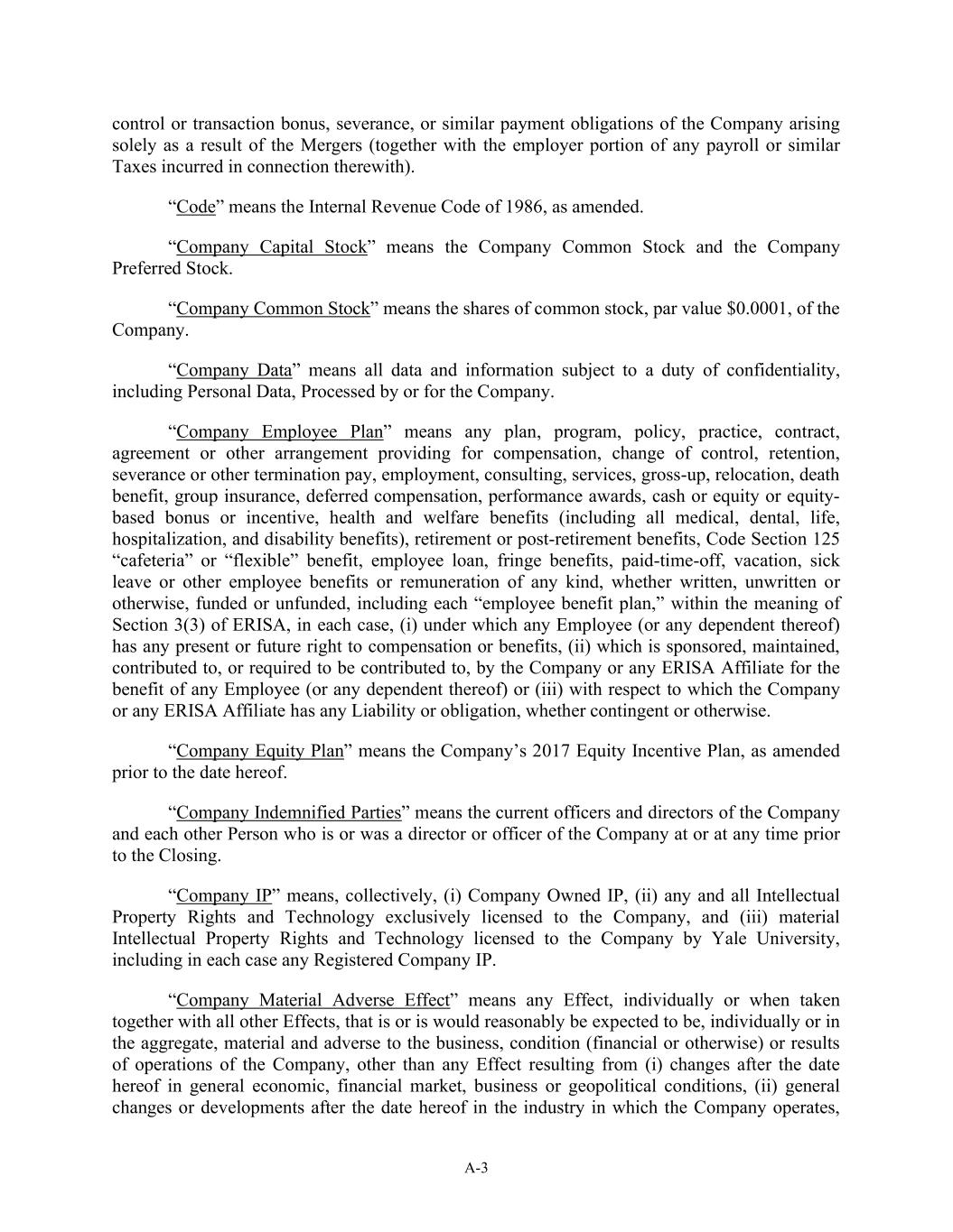 A-3 control or transaction bonus, severance, or similar payment obligations of the Company arising solely as a result of the Mergers (together with the employer portion of any payroll or similar Taxes incurred in connection therewith). “Code” means the Internal Revenue Code of 1986, as amended. “Company Capital Stock” means the Company Common Stock and the Company Preferred Stock. “Company Common Stock” means the shares of common stock, par value $0.0001, of the Company. “Company Data” means all data and information subject to a duty of confidentiality, including Personal Data, Processed by or for the Company. “Company Employee Plan” means any plan, program, policy, practice, contract, agreement or other arrangement providing for compensation, change of control, retention, severance or other termination pay, employment, consulting, services, gross-up, relocation, death benefit, group insurance, deferred compensation, performance awards, cash or equity or equity- based bonus or incentive, health and welfare benefits (including all medical, dental, life, hospitalization, and disability benefits), retirement or post-retirement benefits, Code Section 125 “cafeteria” or “flexible” benefit, employee loan, fringe benefits, paid-time-off, vacation, sick leave or other employee benefits or remuneration of any kind, whether written, unwritten or otherwise, funded or unfunded, including each “employee benefit plan,” within the meaning of Section 3(3) of ERISA, in each case, (i) under which any Employee (or any dependent thereof) has any present or future right to compensation or benefits, (ii) which is sponsored, maintained, contributed to, or required to be contributed to, by the Company or any ERISA Affiliate for the benefit of any Employee (or any dependent thereof) or (iii) with respect to which the Company or any ERISA Affiliate has any Liability or obligation, whether contingent or otherwise. “Company Equity Plan” means the Company’s 2017 Equity Incentive Plan, as amended prior to the date hereof. “Company Indemnified Parties” means the current officers and directors of the Company and each other Person who is or was a director or officer of the Company at or at any time prior to the Closing. “Company IP” means, collectively, (i) Company Owned IP, (ii) any and all Intellectual Property Rights and Technology exclusively licensed to the Company, and (iii) material Intellectual Property Rights and Technology licensed to the Company by Yale University, including in each case any Registered Company IP. “Company Material Adverse Effect” means any Effect, individually or when taken together with all other Effects, that is or is would reasonably be expected to be, individually or in the aggregate, material and adverse to the business, condition (financial or otherwise) or results of operations of the Company, other than any Effect resulting from (i) changes after the date hereof in general economic, financial market, business or geopolitical conditions, (ii) general changes or developments after the date hereof in the industry in which the Company operates,