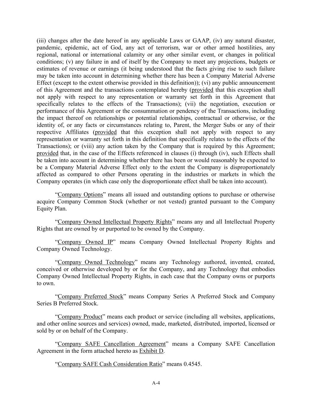A-4 (iii) changes after the date hereof in any applicable Laws or GAAP, (iv) any natural disaster, pandemic, epidemic, act of God, any act of terrorism, war or other armed hostilities, any regional, national or international calamity or any other similar event, or changes in political conditions; (v) any failure in and of itself by the Company to meet any projections, budgets or estimates of revenue or earnings (it being understood that the facts giving rise to such failure may be taken into account in determining whether there has been a Company Material Adverse Effect (except to the extent otherwise provided in this definition)); (vi) any public announcement of this Agreement and the transactions contemplated hereby (provided that this exception shall not apply with respect to any representation or warranty set forth in this Agreement that specifically relates to the effects of the Transactions); (vii) the negotiation, execution or performance of this Agreement or the consummation or pendency of the Transactions, including the impact thereof on relationships or potential relationships, contractual or otherwise, or the identity of, or any facts or circumstances relating to, Parent, the Merger Subs or any of their respective Affiliates (provided that this exception shall not apply with respect to any representation or warranty set forth in this definition that specifically relates to the effects of the Transactions); or (viii) any action taken by the Company that is required by this Agreement; provided that, in the case of the Effects referenced in clauses (i) through (iv), such Effects shall be taken into account in determining whether there has been or would reasonably be expected to be a Company Material Adverse Effect only to the extent the Company is disproportionately affected as compared to other Persons operating in the industries or markets in which the Company operates (in which case only the disproportionate effect shall be taken into account). “Company Options” means all issued and outstanding options to purchase or otherwise acquire Company Common Stock (whether or not vested) granted pursuant to the Company Equity Plan. “Company Owned Intellectual Property Rights” means any and all Intellectual Property Rights that are owned by or purported to be owned by the Company. “Company Owned IP” means Company Owned Intellectual Property Rights and Company Owned Technology. “Company Owned Technology” means any Technology authored, invented, created, conceived or otherwise developed by or for the Company, and any Technology that embodies Company Owned Intellectual Property Rights, in each case that the Company owns or purports to own. “Company Preferred Stock” means Company Series A Preferred Stock and Company Series B Preferred Stock. “Company Product” means each product or service (including all websites, applications, and other online sources and services) owned, made, marketed, distributed, imported, licensed or sold by or on behalf of the Company. “Company SAFE Cancellation Agreement” means a Company SAFE Cancellation Agreement in the form attached hereto as Exhibit D. “Company SAFE Cash Consideration Ratio” means 0.4545.