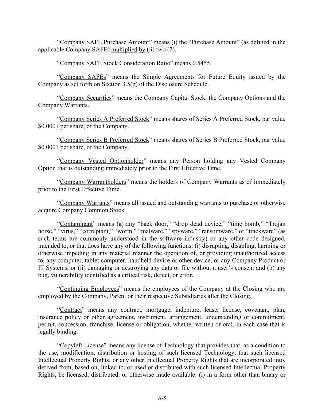 A-5 “Company SAFE Purchase Amount” means (i) the “Purchase Amount” (as defined in the applicable Company SAFE) multiplied by (ii) two (2). “Company SAFE Stock Consideration Ratio” means 0.5455. “Company SAFEs” means the Simple Agreements for Future Equity issued by the Company as set forth on Section 3.5(g) of the Disclosure Schedule. “Company Securities” means the Company Capital Stock, the Company Options and the Company Warrants. “Company Series A Preferred Stock” means shares of Series A Preferred Stock, par value $0.0001 per share, of the Company. “Company Series B Preferred Stock” means shares of Series B Preferred Stock, par value $0.0001 per share, of the Company. “Company Vested Optionholder” means any Person holding any Vested Company Option that is outstanding immediately prior to the First Effective Time. “Company Warrantholders” means the holders of Company Warrants as of immediately prior to the First Effective Time. “Company Warrants” means all issued and outstanding warrants to purchase or otherwise acquire Company Common Stock. “Contaminant” means (a) any “back door,” “drop dead device,” “time bomb,” “Trojan horse,” “virus,” “corruptant,” “worm,” “malware,” “spyware,” “ransomware,” or “trackware” (as such terms are commonly understood in the software industry) or any other code designed, intended to, or that does have any of the following functions: (i) disrupting, disabling, harming or otherwise impeding in any material manner the operation of, or providing unauthorized access to, any computer, tablet computer, handheld device or other device, or any Company Product or IT Systems, or (ii) damaging or destroying any data or file without a user’s consent and (b) any bug, vulnerability identified as a critical risk, defect, or error. “Continuing Employees” means the employees of the Company at the Closing who are employed by the Company, Parent or their respective Subsidiaries after the Closing. “Contract” means any contract, mortgage, indenture, lease, license, covenant, plan, insurance policy or other agreement, instrument, arrangement, understanding or commitment, permit, concession, franchise, license or obligation, whether written or oral, in each case that is legally binding. “Copyleft License” means any license of Technology that provides that, as a condition to the use, modification, distribution or hosting of such licensed Technology, that such licensed Intellectual Property Rights, or any other Intellectual Property Rights that are incorporated into, derived from, based on, linked to, or used or distributed with such licensed Intellectual Property Rights, be licensed, distributed, or otherwise made available: (i) in a form other than binary or