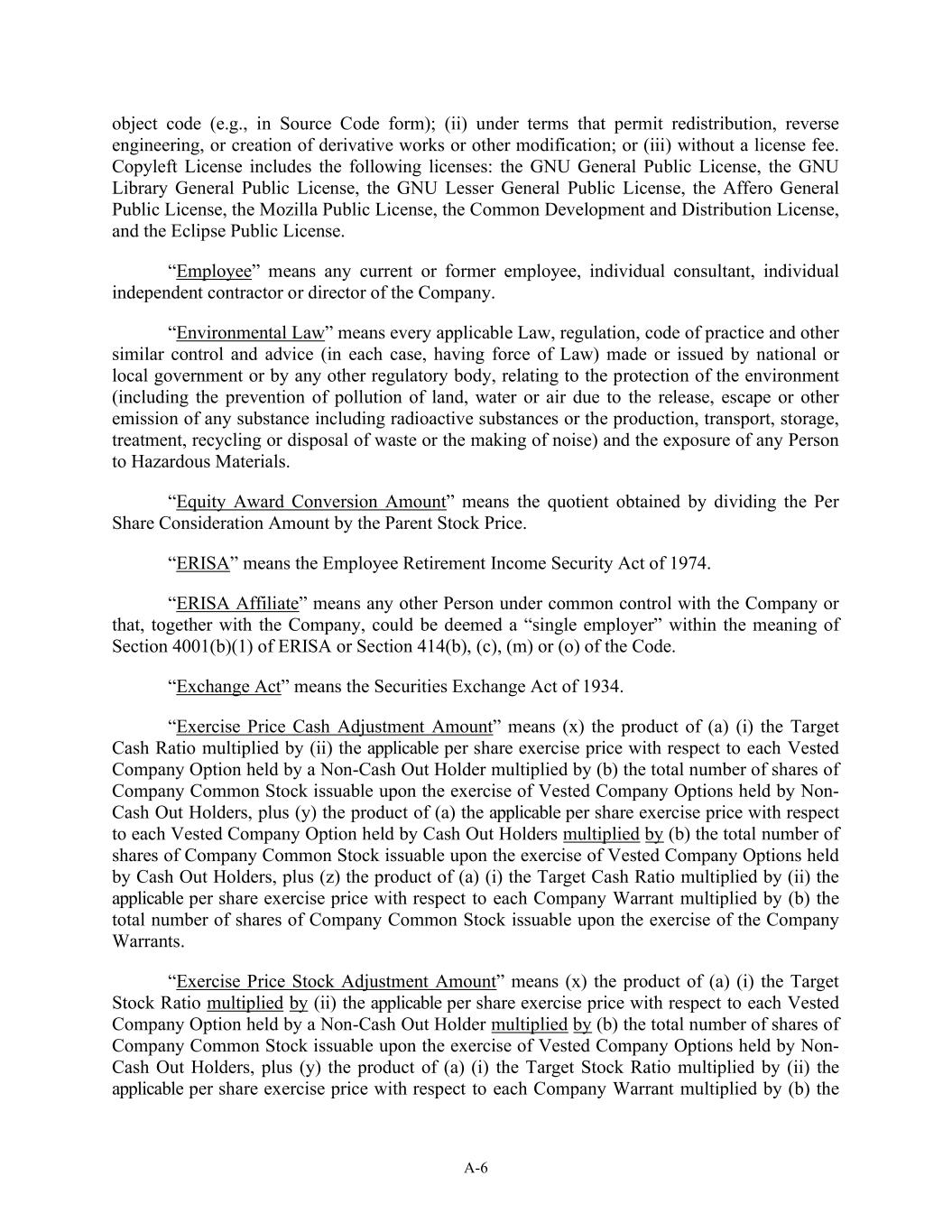A-6 object code (e.g., in Source Code form); (ii) under terms that permit redistribution, reverse engineering, or creation of derivative works or other modification; or (iii) without a license fee. Copyleft License includes the following licenses: the GNU General Public License, the GNU Library General Public License, the GNU Lesser General Public License, the Affero General Public License, the Mozilla Public License, the Common Development and Distribution License, and the Eclipse Public License. “Employee” means any current or former employee, individual consultant, individual independent contractor or director of the Company. “Environmental Law” means every applicable Law, regulation, code of practice and other similar control and advice (in each case, having force of Law) made or issued by national or local government or by any other regulatory body, relating to the protection of the environment (including the prevention of pollution of land, water or air due to the release, escape or other emission of any substance including radioactive substances or the production, transport, storage, treatment, recycling or disposal of waste or the making of noise) and the exposure of any Person to Hazardous Materials. “Equity Award Conversion Amount” means the quotient obtained by dividing the Per Share Consideration Amount by the Parent Stock Price. “ERISA” means the Employee Retirement Income Security Act of 1974. “ERISA Affiliate” means any other Person under common control with the Company or that, together with the Company, could be deemed a “single employer” within the meaning of Section 4001(b)(1) of ERISA or Section 414(b), (c), (m) or (o) of the Code. “Exchange Act” means the Securities Exchange Act of 1934. “Exercise Price Cash Adjustment Amount” means (x) the product of (a) (i) the Target Cash Ratio multiplied by (ii) the applicable per share exercise price with respect to each Vested Company Option held by a Non-Cash Out Holder multiplied by (b) the total number of shares of Company Common Stock issuable upon the exercise of Vested Company Options held by Non- Cash Out Holders, plus (y) the product of (a) the applicable per share exercise price with respect to each Vested Company Option held by Cash Out Holders multiplied by (b) the total number of shares of Company Common Stock issuable upon the exercise of Vested Company Options held by Cash Out Holders, plus (z) the product of (a) (i) the Target Cash Ratio multiplied by (ii) the applicable per share exercise price with respect to each Company Warrant multiplied by (b) the total number of shares of Company Common Stock issuable upon the exercise of the Company Warrants. “Exercise Price Stock Adjustment Amount” means (x) the product of (a) (i) the Target Stock Ratio multiplied by (ii) the applicable per share exercise price with respect to each Vested Company Option held by a Non-Cash Out Holder multiplied by (b) the total number of shares of Company Common Stock issuable upon the exercise of Vested Company Options held by Non- Cash Out Holders, plus (y) the product of (a) (i) the Target Stock Ratio multiplied by (ii) the applicable per share exercise price with respect to each Company Warrant multiplied by (b) the