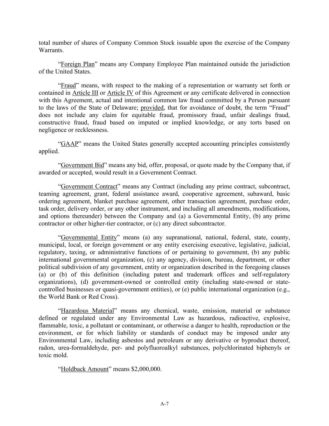 A-7 total number of shares of Company Common Stock issuable upon the exercise of the Company Warrants. “Foreign Plan” means any Company Employee Plan maintained outside the jurisdiction of the United States. “Fraud” means, with respect to the making of a representation or warranty set forth or contained in Article III or Article IV of this Agreement or any certificate delivered in connection with this Agreement, actual and intentional common law fraud committed by a Person pursuant to the laws of the State of Delaware; provided, that for avoidance of doubt, the term “Fraud” does not include any claim for equitable fraud, promissory fraud, unfair dealings fraud, constructive fraud, fraud based on imputed or implied knowledge, or any torts based on negligence or recklessness. “GAAP” means the United States generally accepted accounting principles consistently applied. “Government Bid” means any bid, offer, proposal, or quote made by the Company that, if awarded or accepted, would result in a Government Contract. “Government Contract” means any Contract (including any prime contract, subcontract, teaming agreement, grant, federal assistance award, cooperative agreement, subaward, basic ordering agreement, blanket purchase agreement, other transaction agreement, purchase order, task order, delivery order, or any other instrument, and including all amendments, modifications, and options thereunder) between the Company and (a) a Governmental Entity, (b) any prime contractor or other higher-tier contractor, or (c) any direct subcontractor. “Governmental Entity” means (a) any supranational, national, federal, state, county, municipal, local, or foreign government or any entity exercising executive, legislative, judicial, regulatory, taxing, or administrative functions of or pertaining to government, (b) any public international governmental organization, (c) any agency, division, bureau, department, or other political subdivision of any government, entity or organization described in the foregoing clauses (a) or (b) of this definition (including patent and trademark offices and self-regulatory organizations), (d) government-owned or controlled entity (including state-owned or state- controlled businesses or quasi-government entities), or (e) public international organization (e.g., the World Bank or Red Cross). “Hazardous Material” means any chemical, waste, emission, material or substance defined or regulated under any Environmental Law as hazardous, radioactive, explosive, flammable, toxic, a pollutant or contaminant, or otherwise a danger to health, reproduction or the environment, or for which liability or standards of conduct may be imposed under any Environmental Law, including asbestos and petroleum or any derivative or byproduct thereof, radon, urea-formaldehyde, per- and polyfluoroalkyl substances, polychlorinated biphenyls or toxic mold. “Holdback Amount” means $2,000,000.