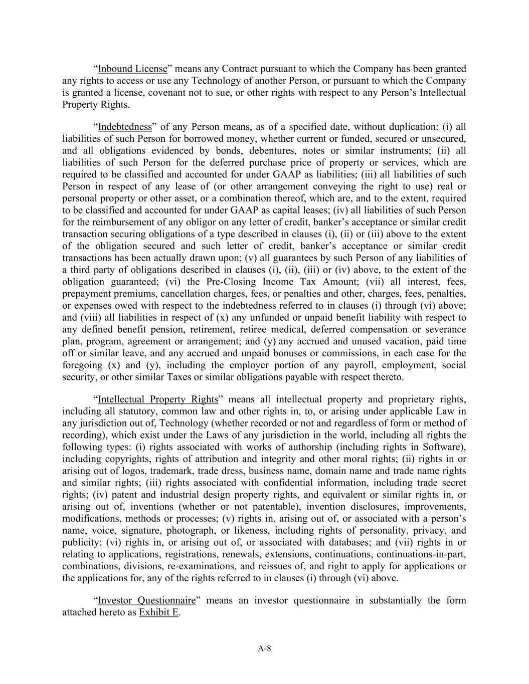A-8 “Inbound License” means any Contract pursuant to which the Company has been granted any rights to access or use any Technology of another Person, or pursuant to which the Company is granted a license, covenant not to sue, or other rights with respect to any Person’s Intellectual Property Rights. “Indebtedness” of any Person means, as of a specified date, without duplication: (i) all liabilities of such Person for borrowed money, whether current or funded, secured or unsecured, and all obligations evidenced by bonds, debentures, notes or similar instruments; (ii) all liabilities of such Person for the deferred purchase price of property or services, which are required to be classified and accounted for under GAAP as liabilities; (iii) all liabilities of such Person in respect of any lease of (or other arrangement conveying the right to use) real or personal property or other asset, or a combination thereof, which are, and to the extent, required to be classified and accounted for under GAAP as capital leases; (iv) all liabilities of such Person for the reimbursement of any obligor on any letter of credit, banker’s acceptance or similar credit transaction securing obligations of a type described in clauses (i), (ii) or (iii) above to the extent of the obligation secured and such letter of credit, banker’s acceptance or similar credit transactions has been actually drawn upon; (v) all guarantees by such Person of any liabilities of a third party of obligations described in clauses (i), (ii), (iii) or (iv) above, to the extent of the obligation guaranteed; (vi) the Pre-Closing Income Tax Amount; (vii) all interest, fees, prepayment premiums, cancellation charges, fees, or penalties and other, charges, fees, penalties, or expenses owed with respect to the indebtedness referred to in clauses (i) through (vi) above; and (viii) all liabilities in respect of (x) any unfunded or unpaid benefit liability with respect to any defined benefit pension, retirement, retiree medical, deferred compensation or severance plan, program, agreement or arrangement; and (y) any accrued and unused vacation, paid time off or similar leave, and any accrued and unpaid bonuses or commissions, in each case for the foregoing (x) and (y), including the employer portion of any payroll, employment, social security, or other similar Taxes or similar obligations payable with respect thereto. “Intellectual Property Rights” means all intellectual property and proprietary rights, including all statutory, common law and other rights in, to, or arising under applicable Law in any jurisdiction out of, Technology (whether recorded or not and regardless of form or method of recording), which exist under the Laws of any jurisdiction in the world, including all rights the following types: (i) rights associated with works of authorship (including rights in Software), including copyrights, rights of attribution and integrity and other moral rights; (ii) rights in or arising out of logos, trademark, trade dress, business name, domain name and trade name rights and similar rights; (iii) rights associated with confidential information, including trade secret rights; (iv) patent and industrial design property rights, and equivalent or similar rights in, or arising out of, inventions (whether or not patentable), invention disclosures, improvements, modifications, methods or processes; (v) rights in, arising out of, or associated with a person’s name, voice, signature, photograph, or likeness, including rights of personality, privacy, and publicity; (vi) rights in, or arising out of, or associated with databases; and (vii) rights in or relating to applications, registrations, renewals, extensions, continuations, continuations-in-part, combinations, divisions, re-examinations, and reissues of, and right to apply for applications or the applications for, any of the rights referred to in clauses (i) through (vi) above. “Investor Questionnaire” means an investor questionnaire in substantially the form attached hereto as Exhibit E.