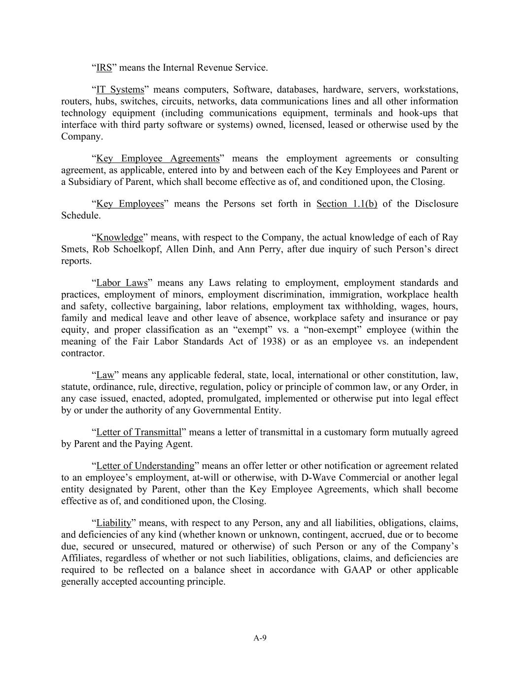A-9 “IRS” means the Internal Revenue Service. “IT Systems” means computers, Software, databases, hardware, servers, workstations, routers, hubs, switches, circuits, networks, data communications lines and all other information technology equipment (including communications equipment, terminals and hook-ups that interface with third party software or systems) owned, licensed, leased or otherwise used by the Company. “Key Employee Agreements” means the employment agreements or consulting agreement, as applicable, entered into by and between each of the Key Employees and Parent or a Subsidiary of Parent, which shall become effective as of, and conditioned upon, the Closing. “Key Employees” means the Persons set forth in Section 1.1(b) of the Disclosure Schedule. “Knowledge” means, with respect to the Company, the actual knowledge of each of Ray Smets, Rob Schoelkopf, Allen Dinh, and Ann Perry, after due inquiry of such Person’s direct reports. “Labor Laws” means any Laws relating to employment, employment standards and practices, employment of minors, employment discrimination, immigration, workplace health and safety, collective bargaining, labor relations, employment tax withholding, wages, hours, family and medical leave and other leave of absence, workplace safety and insurance or pay equity, and proper classification as an “exempt” vs. a “non-exempt” employee (within the meaning of the Fair Labor Standards Act of 1938) or as an employee vs. an independent contractor. “Law” means any applicable federal, state, local, international or other constitution, law, statute, ordinance, rule, directive, regulation, policy or principle of common law, or any Order, in any case issued, enacted, adopted, promulgated, implemented or otherwise put into legal effect by or under the authority of any Governmental Entity. “Letter of Transmittal” means a letter of transmittal in a customary form mutually agreed by Parent and the Paying Agent. “Letter of Understanding” means an offer letter or other notification or agreement related to an employee’s employment, at-will or otherwise, with D-Wave Commercial or another legal entity designated by Parent, other than the Key Employee Agreements, which shall become effective as of, and conditioned upon, the Closing. “Liability” means, with respect to any Person, any and all liabilities, obligations, claims, and deficiencies of any kind (whether known or unknown, contingent, accrued, due or to become due, secured or unsecured, matured or otherwise) of such Person or any of the Company’s Affiliates, regardless of whether or not such liabilities, obligations, claims, and deficiencies are required to be reflected on a balance sheet in accordance with GAAP or other applicable generally accepted accounting principle.