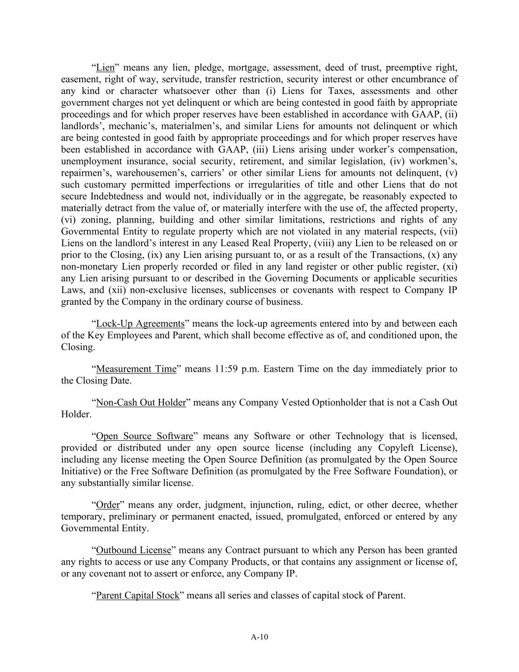 A-10 “Lien” means any lien, pledge, mortgage, assessment, deed of trust, preemptive right, easement, right of way, servitude, transfer restriction, security interest or other encumbrance of any kind or character whatsoever other than (i) Liens for Taxes, assessments and other government charges not yet delinquent or which are being contested in good faith by appropriate proceedings and for which proper reserves have been established in accordance with GAAP, (ii) landlords’, mechanic’s, materialmen’s, and similar Liens for amounts not delinquent or which are being contested in good faith by appropriate proceedings and for which proper reserves have been established in accordance with GAAP, (iii) Liens arising under worker’s compensation, unemployment insurance, social security, retirement, and similar legislation, (iv) workmen’s, repairmen’s, warehousemen’s, carriers’ or other similar Liens for amounts not delinquent, (v) such customary permitted imperfections or irregularities of title and other Liens that do not secure Indebtedness and would not, individually or in the aggregate, be reasonably expected to materially detract from the value of, or materially interfere with the use of, the affected property, (vi) zoning, planning, building and other similar limitations, restrictions and rights of any Governmental Entity to regulate property which are not violated in any material respects, (vii) Liens on the landlord’s interest in any Leased Real Property, (viii) any Lien to be released on or prior to the Closing, (ix) any Lien arising pursuant to, or as a result of the Transactions, (x) any non-monetary Lien properly recorded or filed in any land register or other public register, (xi) any Lien arising pursuant to or described in the Governing Documents or applicable securities Laws, and (xii) non-exclusive licenses, sublicenses or covenants with respect to Company IP granted by the Company in the ordinary course of business. “Lock-Up Agreements” means the lock-up agreements entered into by and between each of the Key Employees and Parent, which shall become effective as of, and conditioned upon, the Closing. “Measurement Time” means 11:59 p.m. Eastern Time on the day immediately prior to the Closing Date. “Non-Cash Out Holder” means any Company Vested Optionholder that is not a Cash Out Holder. “Open Source Software” means any Software or other Technology that is licensed, provided or distributed under any open source license (including any Copyleft License), including any license meeting the Open Source Definition (as promulgated by the Open Source Initiative) or the Free Software Definition (as promulgated by the Free Software Foundation), or any substantially similar license. “Order” means any order, judgment, injunction, ruling, edict, or other decree, whether temporary, preliminary or permanent enacted, issued, promulgated, enforced or entered by any Governmental Entity. “Outbound License” means any Contract pursuant to which any Person has been granted any rights to access or use any Company Products, or that contains any assignment or license of, or any covenant not to assert or enforce, any Company IP. “Parent Capital Stock” means all series and classes of capital stock of Parent.