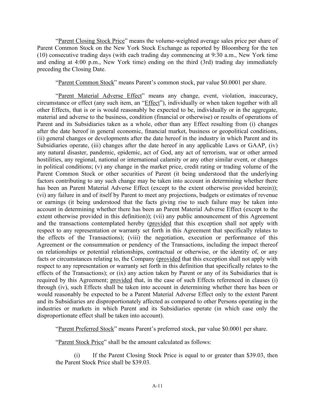 A-11 “Parent Closing Stock Price” means the volume-weighted average sales price per share of Parent Common Stock on the New York Stock Exchange as reported by Bloomberg for the ten (10) consecutive trading days (with each trading day commencing at 9:30 a.m., New York time and ending at 4:00 p.m., New York time) ending on the third (3rd) trading day immediately preceding the Closing Date. “Parent Common Stock” means Parent’s common stock, par value $0.0001 per share. “Parent Material Adverse Effect” means any change, event, violation, inaccuracy, circumstance or effect (any such item, an “Effect”), individually or when taken together with all other Effects, that is or is would reasonably be expected to be, individually or in the aggregate, material and adverse to the business, condition (financial or otherwise) or results of operations of Parent and its Subsidiaries taken as a whole, other than any Effect resulting from (i) changes after the date hereof in general economic, financial market, business or geopolitical conditions, (ii) general changes or developments after the date hereof in the industry in which Parent and its Subsidiaries operate, (iii) changes after the date hereof in any applicable Laws or GAAP, (iv) any natural disaster, pandemic, epidemic, act of God, any act of terrorism, war or other armed hostilities, any regional, national or international calamity or any other similar event, or changes in political conditions; (v) any change in the market price, credit rating or trading volume of the Parent Common Stock or other securities of Parent (it being understood that the underlying factors contributing to any such change may be taken into account in determining whether there has been an Parent Material Adverse Effect (except to the extent otherwise provided herein)); (vi) any failure in and of itself by Parent to meet any projections, budgets or estimates of revenue or earnings (it being understood that the facts giving rise to such failure may be taken into account in determining whether there has been an Parent Material Adverse Effect (except to the extent otherwise provided in this definition)); (vii) any public announcement of this Agreement and the transactions contemplated hereby (provided that this exception shall not apply with respect to any representation or warranty set forth in this Agreement that specifically relates to the effects of the Transactions); (viii) the negotiation, execution or performance of this Agreement or the consummation or pendency of the Transactions, including the impact thereof on relationships or potential relationships, contractual or otherwise, or the identity of, or any facts or circumstances relating to, the Company (provided that this exception shall not apply with respect to any representation or warranty set forth in this definition that specifically relates to the effects of the Transactions); or (ix) any action taken by Parent or any of its Subsidiaries that is required by this Agreement; provided that, in the case of such Effects referenced in clauses (i) through (iv), such Effects shall be taken into account in determining whether there has been or would reasonably be expected to be a Parent Material Adverse Effect only to the extent Parent and its Subsidiaries are disproportionately affected as compared to other Persons operating in the industries or markets in which Parent and its Subsidiaries operate (in which case only the disproportionate effect shall be taken into account). “Parent Preferred Stock” means Parent’s preferred stock, par value $0.0001 per share. “Parent Stock Price” shall be the amount calculated as follows: (i) If the Parent Closing Stock Price is equal to or greater than $39.03, then the Parent Stock Price shall be $39.03.