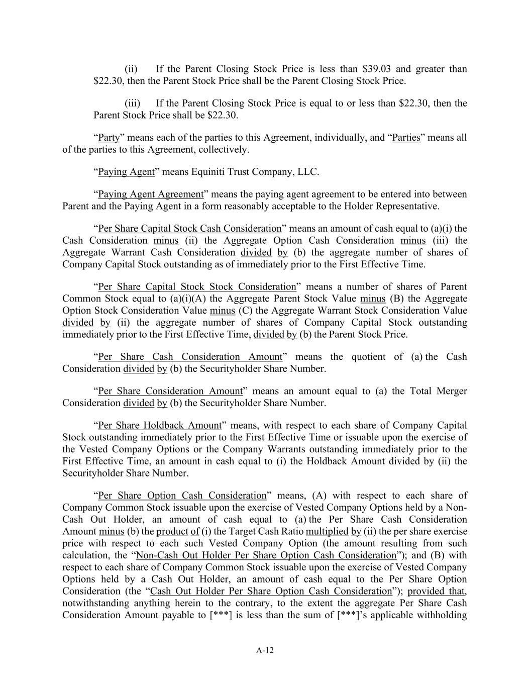 A-12 (ii) If the Parent Closing Stock Price is less than $39.03 and greater than $22.30, then the Parent Stock Price shall be the Parent Closing Stock Price. (iii) If the Parent Closing Stock Price is equal to or less than $22.30, then the Parent Stock Price shall be $22.30. “Party” means each of the parties to this Agreement, individually, and “Parties” means all of the parties to this Agreement, collectively. “Paying Agent” means Equiniti Trust Company, LLC. “Paying Agent Agreement” means the paying agent agreement to be entered into between Parent and the Paying Agent in a form reasonably acceptable to the Holder Representative. “Per Share Capital Stock Cash Consideration” means an amount of cash equal to (a)(i) the Cash Consideration minus (ii) the Aggregate Option Cash Consideration minus (iii) the Aggregate Warrant Cash Consideration divided by (b) the aggregate number of shares of Company Capital Stock outstanding as of immediately prior to the First Effective Time. “Per Share Capital Stock Stock Consideration” means a number of shares of Parent Common Stock equal to (a)(i)(A) the Aggregate Parent Stock Value minus (B) the Aggregate Option Stock Consideration Value minus (C) the Aggregate Warrant Stock Consideration Value divided by (ii) the aggregate number of shares of Company Capital Stock outstanding immediately prior to the First Effective Time, divided by (b) the Parent Stock Price. “Per Share Cash Consideration Amount” means the quotient of (a) the Cash Consideration divided by (b) the Securityholder Share Number. “Per Share Consideration Amount” means an amount equal to (a) the Total Merger Consideration divided by (b) the Securityholder Share Number. “Per Share Holdback Amount” means, with respect to each share of Company Capital Stock outstanding immediately prior to the First Effective Time or issuable upon the exercise of the Vested Company Options or the Company Warrants outstanding immediately prior to the First Effective Time, an amount in cash equal to (i) the Holdback Amount divided by (ii) the Securityholder Share Number. “Per Share Option Cash Consideration” means, (A) with respect to each share of Company Common Stock issuable upon the exercise of Vested Company Options held by a Non- Cash Out Holder, an amount of cash equal to (a) the Per Share Cash Consideration Amount minus (b) the product of (i) the Target Cash Ratio multiplied by (ii) the per share exercise price with respect to each such Vested Company Option (the amount resulting from such calculation, the “Non-Cash Out Holder Per Share Option Cash Consideration”); and (B) with respect to each share of Company Common Stock issuable upon the exercise of Vested Company Options held by a Cash Out Holder, an amount of cash equal to the Per Share Option Consideration (the “Cash Out Holder Per Share Option Cash Consideration”); provided that, notwithstanding anything herein to the contrary, to the extent the aggregate Per Share Cash Consideration Amount payable to [***] is less than the sum of [***]’s applicable withholding
