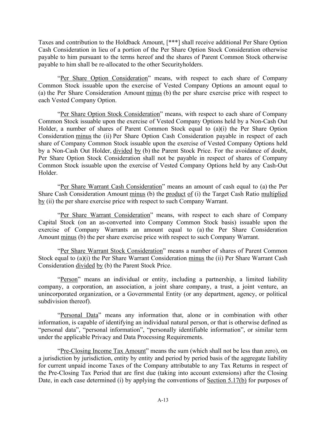 A-13 Taxes and contribution to the Holdback Amount, [***] shall receive additional Per Share Option Cash Consideration in lieu of a portion of the Per Share Option Stock Consideration otherwise payable to him pursuant to the terms hereof and the shares of Parent Common Stock otherwise payable to him shall be re-allocated to the other Securityholders. “Per Share Option Consideration” means, with respect to each share of Company Common Stock issuable upon the exercise of Vested Company Options an amount equal to (a) the Per Share Consideration Amount minus (b) the per share exercise price with respect to each Vested Company Option. “Per Share Option Stock Consideration” means, with respect to each share of Company Common Stock issuable upon the exercise of Vested Company Options held by a Non-Cash Out Holder, a number of shares of Parent Common Stock equal to (a)(i) the Per Share Option Consideration minus the (ii) Per Share Option Cash Consideration payable in respect of each share of Company Common Stock issuable upon the exercise of Vested Company Options held by a Non-Cash Out Holder, divided by (b) the Parent Stock Price. For the avoidance of doubt, Per Share Option Stock Consideration shall not be payable in respect of shares of Company Common Stock issuable upon the exercise of Vested Company Options held by any Cash-Out Holder. “Per Share Warrant Cash Consideration” means an amount of cash equal to (a) the Per Share Cash Consideration Amount minus (b) the product of (i) the Target Cash Ratio multiplied by (ii) the per share exercise price with respect to such Company Warrant. “Per Share Warrant Consideration” means, with respect to each share of Company Capital Stock (on an as-converted into Company Common Stock basis) issuable upon the exercise of Company Warrants an amount equal to (a) the Per Share Consideration Amount minus (b) the per share exercise price with respect to such Company Warrant. “Per Share Warrant Stock Consideration” means a number of shares of Parent Common Stock equal to (a)(i) the Per Share Warrant Consideration minus the (ii) Per Share Warrant Cash Consideration divided by (b) the Parent Stock Price. “Person” means an individual or entity, including a partnership, a limited liability company, a corporation, an association, a joint share company, a trust, a joint venture, an unincorporated organization, or a Governmental Entity (or any department, agency, or political subdivision thereof). “Personal Data” means any information that, alone or in combination with other information, is capable of identifying an individual natural person, or that is otherwise defined as “personal data”, “personal information”, “personally identifiable information”, or similar term under the applicable Privacy and Data Processing Requirements. “Pre-Closing Income Tax Amount” means the sum (which shall not be less than zero), on a jurisdiction by jurisdiction, entity by entity and period by period basis of the aggregate liability for current unpaid income Taxes of the Company attributable to any Tax Returns in respect of the Pre-Closing Tax Period that are first due (taking into account extensions) after the Closing Date, in each case determined (i) by applying the conventions of Section 5.17(b) for purposes of