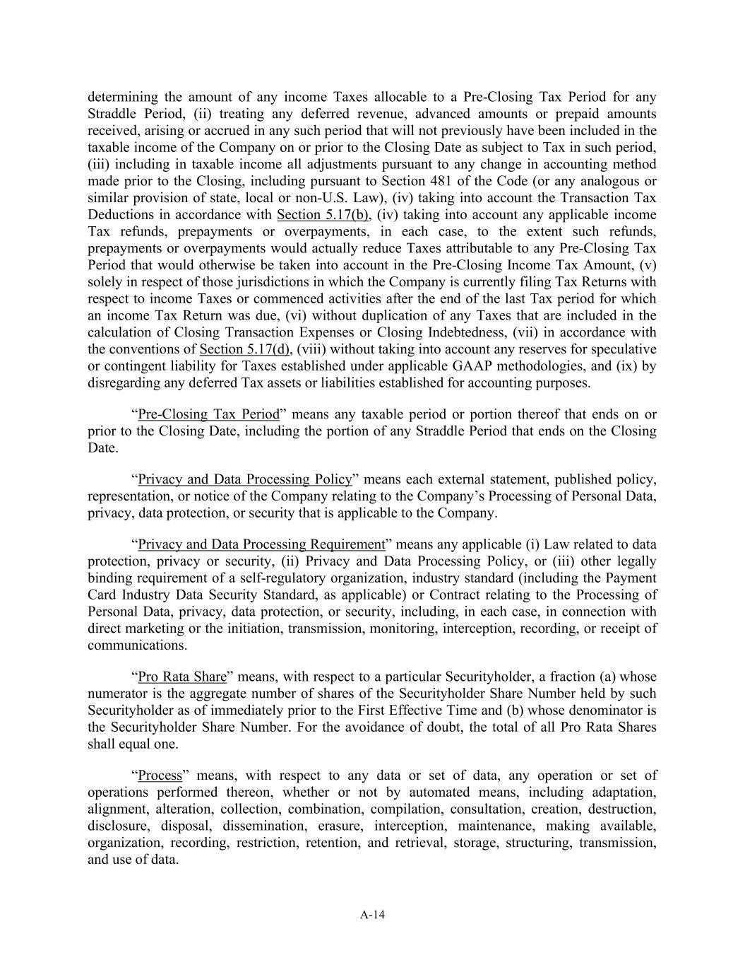 A-14 determining the amount of any income Taxes allocable to a Pre-Closing Tax Period for any Straddle Period, (ii) treating any deferred revenue, advanced amounts or prepaid amounts received, arising or accrued in any such period that will not previously have been included in the taxable income of the Company on or prior to the Closing Date as subject to Tax in such period, (iii) including in taxable income all adjustments pursuant to any change in accounting method made prior to the Closing, including pursuant to Section 481 of the Code (or any analogous or similar provision of state, local or non-U.S. Law), (iv) taking into account the Transaction Tax Deductions in accordance with Section 5.17(b), (iv) taking into account any applicable income Tax refunds, prepayments or overpayments, in each case, to the extent such refunds, prepayments or overpayments would actually reduce Taxes attributable to any Pre-Closing Tax Period that would otherwise be taken into account in the Pre-Closing Income Tax Amount, (v) solely in respect of those jurisdictions in which the Company is currently filing Tax Returns with respect to income Taxes or commenced activities after the end of the last Tax period for which an income Tax Return was due, (vi) without duplication of any Taxes that are included in the calculation of Closing Transaction Expenses or Closing Indebtedness, (vii) in accordance with the conventions of Section 5.17(d), (viii) without taking into account any reserves for speculative or contingent liability for Taxes established under applicable GAAP methodologies, and (ix) by disregarding any deferred Tax assets or liabilities established for accounting purposes. “Pre-Closing Tax Period” means any taxable period or portion thereof that ends on or prior to the Closing Date, including the portion of any Straddle Period that ends on the Closing Date. “Privacy and Data Processing Policy” means each external statement, published policy, representation, or notice of the Company relating to the Company’s Processing of Personal Data, privacy, data protection, or security that is applicable to the Company. “Privacy and Data Processing Requirement” means any applicable (i) Law related to data protection, privacy or security, (ii) Privacy and Data Processing Policy, or (iii) other legally binding requirement of a self-regulatory organization, industry standard (including the Payment Card Industry Data Security Standard, as applicable) or Contract relating to the Processing of Personal Data, privacy, data protection, or security, including, in each case, in connection with direct marketing or the initiation, transmission, monitoring, interception, recording, or receipt of communications. “Pro Rata Share” means, with respect to a particular Securityholder, a fraction (a) whose numerator is the aggregate number of shares of the Securityholder Share Number held by such Securityholder as of immediately prior to the First Effective Time and (b) whose denominator is the Securityholder Share Number. For the avoidance of doubt, the total of all Pro Rata Shares shall equal one. “Process” means, with respect to any data or set of data, any operation or set of operations performed thereon, whether or not by automated means, including adaptation, alignment, alteration, collection, combination, compilation, consultation, creation, destruction, disclosure, disposal, dissemination, erasure, interception, maintenance, making available, organization, recording, restriction, retention, and retrieval, storage, structuring, transmission, and use of data.