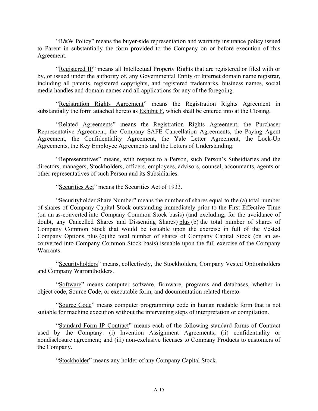 A-15 “R&W Policy” means the buyer-side representation and warranty insurance policy issued to Parent in substantially the form provided to the Company on or before execution of this Agreement. “Registered IP” means all Intellectual Property Rights that are registered or filed with or by, or issued under the authority of, any Governmental Entity or Internet domain name registrar, including all patents, registered copyrights, and registered trademarks, business names, social media handles and domain names and all applications for any of the foregoing. “Registration Rights Agreement” means the Registration Rights Agreement in substantially the form attached hereto as Exhibit F, which shall be entered into at the Closing. “Related Agreements” means the Registration Rights Agreement, the Purchaser Representative Agreement, the Company SAFE Cancellation Agreements, the Paying Agent Agreement, the Confidentiality Agreement, the Yale Letter Agreement, the Lock-Up Agreements, the Key Employee Agreements and the Letters of Understanding. “Representatives” means, with respect to a Person, such Person’s Subsidiaries and the directors, managers, Stockholders, officers, employees, advisors, counsel, accountants, agents or other representatives of such Person and its Subsidiaries. “Securities Act” means the Securities Act of 1933. “Securityholder Share Number” means the number of shares equal to the (a) total number of shares of Company Capital Stock outstanding immediately prior to the First Effective Time (on an as-converted into Company Common Stock basis) (and excluding, for the avoidance of doubt, any Cancelled Shares and Dissenting Shares) plus (b) the total number of shares of Company Common Stock that would be issuable upon the exercise in full of the Vested Company Options, plus (c) the total number of shares of Company Capital Stock (on an as- converted into Company Common Stock basis) issuable upon the full exercise of the Company Warrants. “Securityholders” means, collectively, the Stockholders, Company Vested Optionholders and Company Warrantholders. “Software” means computer software, firmware, programs and databases, whether in object code, Source Code, or executable form, and documentation related thereto. “Source Code” means computer programming code in human readable form that is not suitable for machine execution without the intervening steps of interpretation or compilation. “Standard Form IP Contract” means each of the following standard forms of Contract used by the Company: (i) Invention Assignment Agreements; (ii) confidentiality or nondisclosure agreement; and (iii) non-exclusive licenses to Company Products to customers of the Company. “Stockholder” means any holder of any Company Capital Stock.