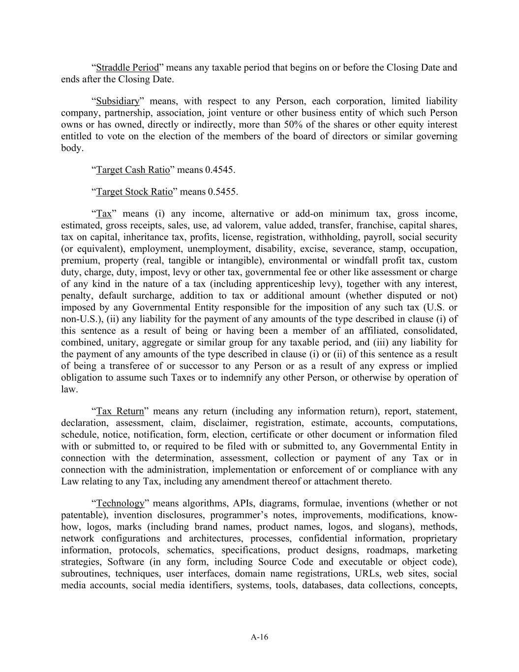 A-16 “Straddle Period” means any taxable period that begins on or before the Closing Date and ends after the Closing Date. “Subsidiary” means, with respect to any Person, each corporation, limited liability company, partnership, association, joint venture or other business entity of which such Person owns or has owned, directly or indirectly, more than 50% of the shares or other equity interest entitled to vote on the election of the members of the board of directors or similar governing body. “Target Cash Ratio” means 0.4545. “Target Stock Ratio” means 0.5455. “Tax” means (i) any income, alternative or add-on minimum tax, gross income, estimated, gross receipts, sales, use, ad valorem, value added, transfer, franchise, capital shares, tax on capital, inheritance tax, profits, license, registration, withholding, payroll, social security (or equivalent), employment, unemployment, disability, excise, severance, stamp, occupation, premium, property (real, tangible or intangible), environmental or windfall profit tax, custom duty, charge, duty, impost, levy or other tax, governmental fee or other like assessment or charge of any kind in the nature of a tax (including apprenticeship levy), together with any interest, penalty, default surcharge, addition to tax or additional amount (whether disputed or not) imposed by any Governmental Entity responsible for the imposition of any such tax (U.S. or non-U.S.), (ii) any liability for the payment of any amounts of the type described in clause (i) of this sentence as a result of being or having been a member of an affiliated, consolidated, combined, unitary, aggregate or similar group for any taxable period, and (iii) any liability for the payment of any amounts of the type described in clause (i) or (ii) of this sentence as a result of being a transferee of or successor to any Person or as a result of any express or implied obligation to assume such Taxes or to indemnify any other Person, or otherwise by operation of law. “Tax Return” means any return (including any information return), report, statement, declaration, assessment, claim, disclaimer, registration, estimate, accounts, computations, schedule, notice, notification, form, election, certificate or other document or information filed with or submitted to, or required to be filed with or submitted to, any Governmental Entity in connection with the determination, assessment, collection or payment of any Tax or in connection with the administration, implementation or enforcement of or compliance with any Law relating to any Tax, including any amendment thereof or attachment thereto. “Technology” means algorithms, APIs, diagrams, formulae, inventions (whether or not patentable), invention disclosures, programmer’s notes, improvements, modifications, know- how, logos, marks (including brand names, product names, logos, and slogans), methods, network configurations and architectures, processes, confidential information, proprietary information, protocols, schematics, specifications, product designs, roadmaps, marketing strategies, Software (in any form, including Source Code and executable or object code), subroutines, techniques, user interfaces, domain name registrations, URLs, web sites, social media accounts, social media identifiers, systems, tools, databases, data collections, concepts,