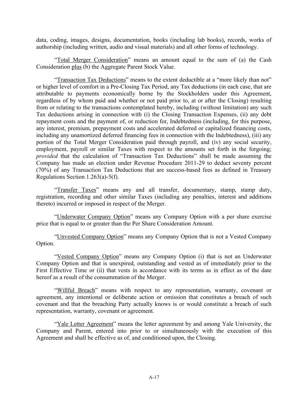 A-17 data, coding, images, designs, documentation, books (including lab books), records, works of authorship (including written, audio and visual materials) and all other forms of technology. “Total Merger Consideration” means an amount equal to the sum of (a) the Cash Consideration plus (b) the Aggregate Parent Stock Value. “Transaction Tax Deductions” means to the extent deductible at a “more likely than not” or higher level of comfort in a Pre-Closing Tax Period, any Tax deductions (in each case, that are attributable to payments economically borne by the Stockholders under this Agreement, regardless of by whom paid and whether or not paid prior to, at or after the Closing) resulting from or relating to the transactions contemplated hereby, including (without limitation) any such Tax deductions arising in connection with (i) the Closing Transaction Expenses, (ii) any debt repayment costs and the payment of, or reduction for, Indebtedness (including, for this purpose, any interest, premium, prepayment costs and accelerated deferred or capitalized financing costs, including any unamortized deferred financing fees in connection with the Indebtedness), (iii) any portion of the Total Merger Consideration paid through payroll, and (iv) any social security, employment, payroll or similar Taxes with respect to the amounts set forth in the forgoing; provided that the calculation of “Transaction Tax Deductions” shall be made assuming the Company has made an election under Revenue Procedure 2011-29 to deduct seventy percent (70%) of any Transaction Tax Deductions that are success-based fees as defined in Treasury Regulations Section 1.263(a)-5(f). “Transfer Taxes” means any and all transfer, documentary, stamp, stamp duty, registration, recording and other similar Taxes (including any penalties, interest and additions thereto) incurred or imposed in respect of the Merger. “Underwater Company Option” means any Company Option with a per share exercise price that is equal to or greater than the Per Share Consideration Amount. “Unvested Company Option” means any Company Option that is not a Vested Company Option. “Vested Company Option” means any Company Option (i) that is not an Underwater Company Option and that is unexpired, outstanding and vested as of immediately prior to the First Effective Time or (ii) that vests in accordance with its terms as in effect as of the date hereof as a result of the consummation of the Merger. “Willful Breach” means with respect to any representation, warranty, covenant or agreement, any intentional or deliberate action or omission that constitutes a breach of such covenant and that the breaching Party actually knows is or would constitute a breach of such representation, warranty, covenant or agreement. “Yale Letter Agreement” means the letter agreement by and among Yale University, the Company and Parent, entered into prior to or simultaneously with the execution of this Agreement and shall be effective as of, and conditioned upon, the Closing.