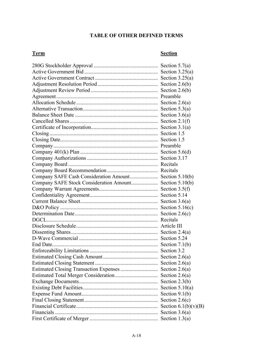 A-18 TABLE OF OTHER DEFINED TERMS Term Section 280G Stockholder Approval ................................................................Section 5.7(a) Active Government Bid ................................................................Section 3.25(a) Active Government Contract ................................................................Section 3.25(a) Adjustment Resolution Period ................................................................Section 2 6(b) Adjustment Review Period ................................................................Section 2.6(b) Agreement ................................................................................................Preamble Allocation Schedule ................................................................Section 2.6(a) Alternative Transaction ................................................................Section 5.3(a) Balance Sheet Date ................................................................Section 3.6(a) Cancelled Shares ................................................................................................Section 2 1(f) Certificate of Incorporation................................................................Section 3.1(a) Closing ................................................................................................Section 1.5 Closing Date................................................................................................Section 1 5 Company ................................................................................................Preamble Company 401(k) Plan ................................................................Section 5.6(d) Company Authorizations ................................................................Section 3.17 Company Board ................................................................................................Recitals Company Board Recommendation ................................................................Recitals Company SAFE Cash Consideration Amount ................................Section 5.10(b) Company SAFE Stock Consideration Amount................................Section 5.10(b) Company Warrant Agreements................................................................Section 3 5(f) Confidentiality Agreement................................................................Section 5.14 Current Balance Sheet................................................................Section 3.6(a) D&O Policy ................................................................................................Section 5 16(c) Determination Date ................................................................Section 2.6(c) DGCL ................................................................................................Recitals Disclosure Schedule ................................................................Article III Dissenting Shares ................................................................................................Section 2 4(a) D-Wave Commercial ................................................................Section 5.24 End Date................................................................................................Section 7.1(b) Enforceability Limitations ................................................................Section 3.2 Estimated Closing Cash Amount ................................................................Section 2 6(a) Estimated Closing Statement ................................................................Section 2.6(a) Estimated Closing Transaction Expenses ................................Section 2.6(a) Estimated Total Merger Consideration ................................................................Section 2 6(a) Exchange Documents................................................................Section 2.3(b) Existing Debt Facilities ................................................................Section 5.10(a) Expense Fund Amount ................................................................Section 9.1(b) Final Closing Statement ................................................................Section 2.6(c) Financial Certificate ................................................................Section 6.1(b)(v)(B) Financials ................................................................................................Section 3 6(a) First Certificate of Merger ................................................................Section 1.3(a)
