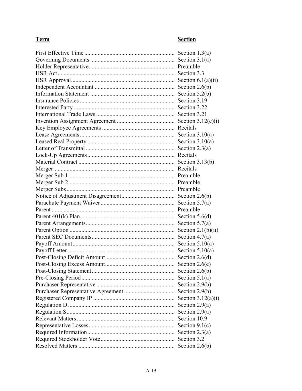 A-19 Term Section First Effective Time ................................................................Section 1.3(a) Governing Documents ................................................................Section 3.1(a) Holder Representative ................................................................Preamble HSR Act ................................................................................................Section 3.3 HSR Approval ................................................................................................Section 6 1(a)(ii) Independent Accountant ................................................................Section 2.6(b) Information Statement ................................................................Section 5.2(b) Insurance Policies ................................................................................................Section 3 19 Interested Party ................................................................................................Section 3 22 International Trade Laws ................................................................Section 3.21 Invention Assignment Agreement ................................................................Section 3 12(c)(i) Key Employee Agreements ................................................................Recitals Lease Agreements ................................................................................................Section 3 10(a) Leased Real Property ................................................................Section 3.10(a) Letter of Transmittal ................................................................Section 2.3(a) Lock-Up Agreements ................................................................Recitals Material Contract ................................................................................................Section 3 13(b) Merger ................................................................................................Recitals Merger Sub 1................................................................................................Preamble Merger Sub 2................................................................................................Preamble Merger Subs ................................................................................................Preamble Notice of Adjustment Disagreement ................................................................Section 2 6(b) Parachute Payment Waiver ................................................................Section 5.7(a) Parent ................................................................................................Preamble Parent 401(k) Plan................................................................................................Section 5 6(d) Parent Arrangements ................................................................Section 5.7(a) Parent Option ................................................................................................Section 2 1(b)(ii) Parent SEC Documents ................................................................Section 4.7(a) Payoff Amount ................................................................................................Section 5 10(a) Payoff Letter ................................................................................................Section 5 10(a) Post-Closing Deficit Amount ................................................................Section 2.6(d) Post-Closing Excess Amount ................................................................Section 2.6(e) Post-Closing Statement ................................................................Section 2.6(b) Pre-Closing Period ................................................................ Section 5.1(a) Purchaser Representative ................................................................Section 2.9(b) Purchaser Representative Agreement ................................................................Section 2 9(b) Registered Company IP ................................................................Section 3.12(a)(i) Regulation D ................................................................................................Section 2 9(a) Regulation S ................................................................................................Section 2 9(a) Relevant Matters ................................................................................................Section 10 9 Representative Losses ................................................................Section 9.1(c) Required Information ................................................................Section 2.3(a) Required Stockholder Vote ................................................................Section 3.2 Resolved Matters ................................................................................................Section 2 6(b)