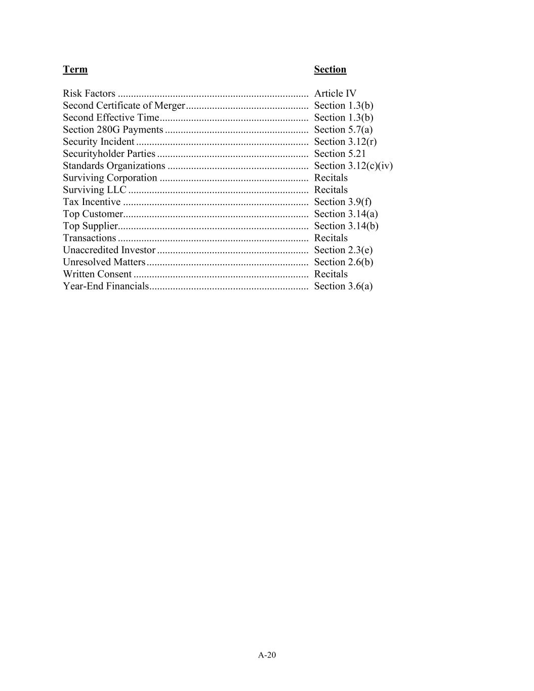 A-20 Term Section Risk Factors ................................................................................................Article IV Second Certificate of Merger ................................................................Section 1.3(b) Second Effective Time ................................................................Section 1.3(b) Section 280G Payments ................................................................Section 5.7(a) Security Incident ................................................................................................Section 3 12(r) Securityholder Parties ................................................................Section 5.21 Standards Organizations ................................................................Section 3.12(c)(iv) Surviving Corporation ................................................................Recitals Surviving LLC ................................................................................................Recitals Tax Incentive ................................................................................................Section 3 9(f) Top Customer................................................................................................Section 3 14(a) Top Supplier................................................................................................Section 3 14(b) Transactions ................................................................................................Recitals Unaccredited Investor ................................................................Section 2.3(e) Unresolved Matters ................................................................Section 2.6(b) Written Consent ................................................................................................Recitals Year-End Financials................................................................Section 3.6(a)