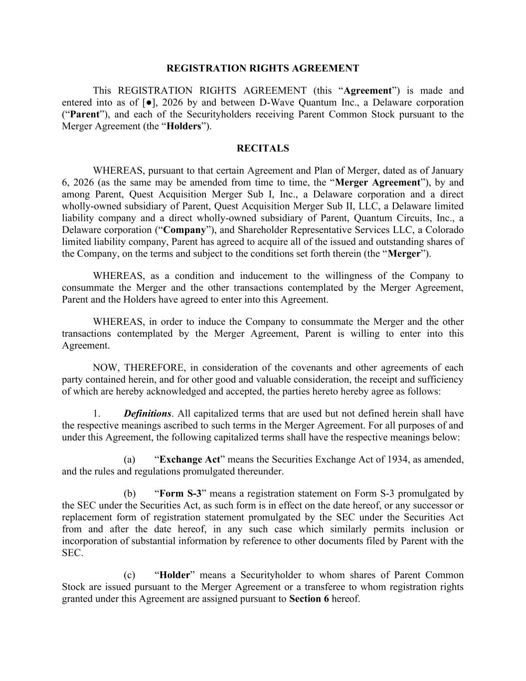 REGISTRATION RIGHTS AGREEMENT This REGISTRATION RIGHTS AGREEMENT (this “Agreement”) is made and entered into as of [●], 2026 by and between D-Wave Quantum Inc., a Delaware corporation (“Parent”), and each of the Securityholders receiving Parent Common Stock pursuant to the Merger Agreement (the “Holders”). RECITALS WHEREAS, pursuant to that certain Agreement and Plan of Merger, dated as of January 6, 2026 (as the same may be amended from time to time, the “Merger Agreement”), by and among Parent, Quest Acquisition Merger Sub I, Inc., a Delaware corporation and a direct wholly-owned subsidiary of Parent, Quest Acquisition Merger Sub II, LLC, a Delaware limited liability company and a direct wholly-owned subsidiary of Parent, Quantum Circuits, Inc., a Delaware corporation (“Company”), and Shareholder Representative Services LLC, a Colorado limited liability company, Parent has agreed to acquire all of the issued and outstanding shares of the Company, on the terms and subject to the conditions set forth therein (the “Merger”). WHEREAS, as a condition and inducement to the willingness of the Company to consummate the Merger and the other transactions contemplated by the Merger Agreement, Parent and the Holders have agreed to enter into this Agreement. WHEREAS, in order to induce the Company to consummate the Merger and the other transactions contemplated by the Merger Agreement, Parent is willing to enter into this Agreement. NOW, THEREFORE, in consideration of the covenants and other agreements of each party contained herein, and for other good and valuable consideration, the receipt and sufficiency of which are hereby acknowledged and accepted, the parties hereto hereby agree as follows: 1. Definitions. All capitalized terms that are used but not defined herein shall have the respective meanings ascribed to such terms in the Merger Agreement. For all purposes of and under this Agreement, the following capitalized terms shall have the respective meanings below: (a) “Exchange Act” means the Securities Exchange Act of 1934, as amended, and the rules and regulations promulgated thereunder. (b) “Form S-3” means a registration statement on Form S-3 promulgated by the SEC under the Securities Act, as such form is in effect on the date hereof, or any successor or replacement form of registration statement promulgated by the SEC under the Securities Act from and after the date hereof, in any such case which similarly permits inclusion or incorporation of substantial information by reference to other documents filed by Parent with the SEC. (c) “Holder” means a Securityholder to whom shares of Parent Common Stock are issued pursuant to the Merger Agreement or a transferee to whom registration rights granted under this Agreement are assigned pursuant to Section 6 hereof.