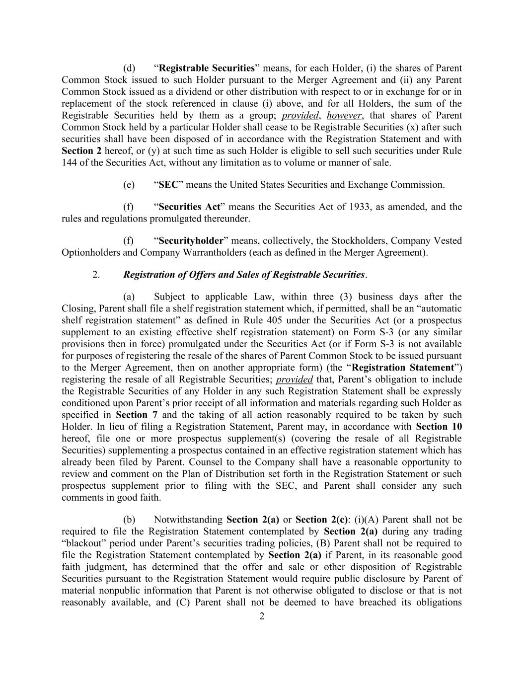 2 (d) “Registrable Securities” means, for each Holder, (i) the shares of Parent Common Stock issued to such Holder pursuant to the Merger Agreement and (ii) any Parent Common Stock issued as a dividend or other distribution with respect to or in exchange for or in replacement of the stock referenced in clause (i) above, and for all Holders, the sum of the Registrable Securities held by them as a group; provided, however, that shares of Parent Common Stock held by a particular Holder shall cease to be Registrable Securities (x) after such securities shall have been disposed of in accordance with the Registration Statement and with Section 2 hereof, or (y) at such time as such Holder is eligible to sell such securities under Rule 144 of the Securities Act, without any limitation as to volume or manner of sale. (e) “SEC” means the United States Securities and Exchange Commission. (f) “Securities Act” means the Securities Act of 1933, as amended, and the rules and regulations promulgated thereunder. (f) “Securityholder” means, collectively, the Stockholders, Company Vested Optionholders and Company Warrantholders (each as defined in the Merger Agreement). 2. Registration of Offers and Sales of Registrable Securities. (a) Subject to applicable Law, within three (3) business days after the Closing, Parent shall file a shelf registration statement which, if permitted, shall be an “automatic shelf registration statement” as defined in Rule 405 under the Securities Act (or a prospectus supplement to an existing effective shelf registration statement) on Form S-3 (or any similar provisions then in force) promulgated under the Securities Act (or if Form S-3 is not available for purposes of registering the resale of the shares of Parent Common Stock to be issued pursuant to the Merger Agreement, then on another appropriate form) (the “Registration Statement”) registering the resale of all Registrable Securities; provided that, Parent’s obligation to include the Registrable Securities of any Holder in any such Registration Statement shall be expressly conditioned upon Parent’s prior receipt of all information and materials regarding such Holder as specified in Section 7 and the taking of all action reasonably required to be taken by such Holder. In lieu of filing a Registration Statement, Parent may, in accordance with Section 10 hereof, file one or more prospectus supplement(s) (covering the resale of all Registrable Securities) supplementing a prospectus contained in an effective registration statement which has already been filed by Parent. Counsel to the Company shall have a reasonable opportunity to review and comment on the Plan of Distribution set forth in the Registration Statement or such prospectus supplement prior to filing with the SEC, and Parent shall consider any such comments in good faith. (b) Notwithstanding Section 2(a) or Section 2(c): (i)(A) Parent shall not be required to file the Registration Statement contemplated by Section 2(a) during any trading “blackout” period under Parent’s securities trading policies, (B) Parent shall not be required to file the Registration Statement contemplated by Section 2(a) if Parent, in its reasonable good faith judgment, has determined that the offer and sale or other disposition of Registrable Securities pursuant to the Registration Statement would require public disclosure by Parent of material nonpublic information that Parent is not otherwise obligated to disclose or that is not reasonably available, and (C) Parent shall not be deemed to have breached its obligations