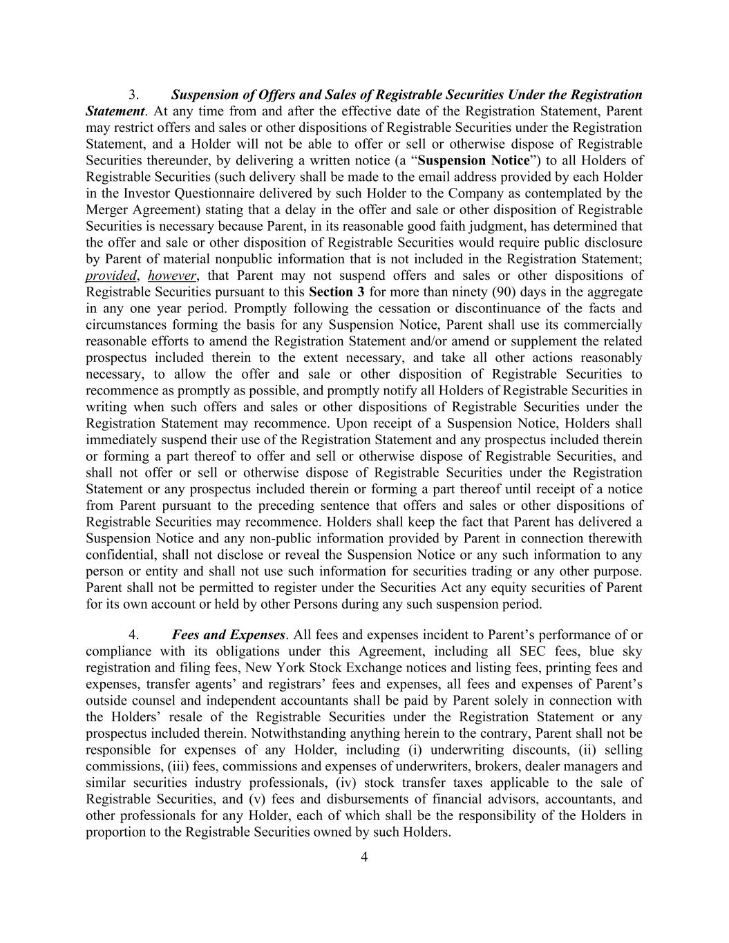 4 3. Suspension of Offers and Sales of Registrable Securities Under the Registration Statement. At any time from and after the effective date of the Registration Statement, Parent may restrict offers and sales or other dispositions of Registrable Securities under the Registration Statement, and a Holder will not be able to offer or sell or otherwise dispose of Registrable Securities thereunder, by delivering a written notice (a “Suspension Notice”) to all Holders of Registrable Securities (such delivery shall be made to the email address provided by each Holder in the Investor Questionnaire delivered by such Holder to the Company as contemplated by the Merger Agreement) stating that a delay in the offer and sale or other disposition of Registrable Securities is necessary because Parent, in its reasonable good faith judgment, has determined that the offer and sale or other disposition of Registrable Securities would require public disclosure by Parent of material nonpublic information that is not included in the Registration Statement; provided, however, that Parent may not suspend offers and sales or other dispositions of Registrable Securities pursuant to this Section 3 for more than ninety (90) days in the aggregate in any one year period. Promptly following the cessation or discontinuance of the facts and circumstances forming the basis for any Suspension Notice, Parent shall use its commercially reasonable efforts to amend the Registration Statement and/or amend or supplement the related prospectus included therein to the extent necessary, and take all other actions reasonably necessary, to allow the offer and sale or other disposition of Registrable Securities to recommence as promptly as possible, and promptly notify all Holders of Registrable Securities in writing when such offers and sales or other dispositions of Registrable Securities under the Registration Statement may recommence. Upon receipt of a Suspension Notice, Holders shall immediately suspend their use of the Registration Statement and any prospectus included therein or forming a part thereof to offer and sell or otherwise dispose of Registrable Securities, and shall not offer or sell or otherwise dispose of Registrable Securities under the Registration Statement or any prospectus included therein or forming a part thereof until receipt of a notice from Parent pursuant to the preceding sentence that offers and sales or other dispositions of Registrable Securities may recommence. Holders shall keep the fact that Parent has delivered a Suspension Notice and any non-public information provided by Parent in connection therewith confidential, shall not disclose or reveal the Suspension Notice or any such information to any person or entity and shall not use such information for securities trading or any other purpose. Parent shall not be permitted to register under the Securities Act any equity securities of Parent for its own account or held by other Persons during any such suspension period. 4. Fees and Expenses. All fees and expenses incident to Parent’s performance of or compliance with its obligations under this Agreement, including all SEC fees, blue sky registration and filing fees, New York Stock Exchange notices and listing fees, printing fees and expenses, transfer agents’ and registrars’ fees and expenses, all fees and expenses of Parent’s outside counsel and independent accountants shall be paid by Parent solely in connection with the Holders’ resale of the Registrable Securities under the Registration Statement or any prospectus included therein. Notwithstanding anything herein to the contrary, Parent shall not be responsible for expenses of any Holder, including (i) underwriting discounts, (ii) selling commissions, (iii) fees, commissions and expenses of underwriters, brokers, dealer managers and similar securities industry professionals, (iv) stock transfer taxes applicable to the sale of Registrable Securities, and (v) fees and disbursements of financial advisors, accountants, and other professionals for any Holder, each of which shall be the responsibility of the Holders in proportion to the Registrable Securities owned by such Holders.