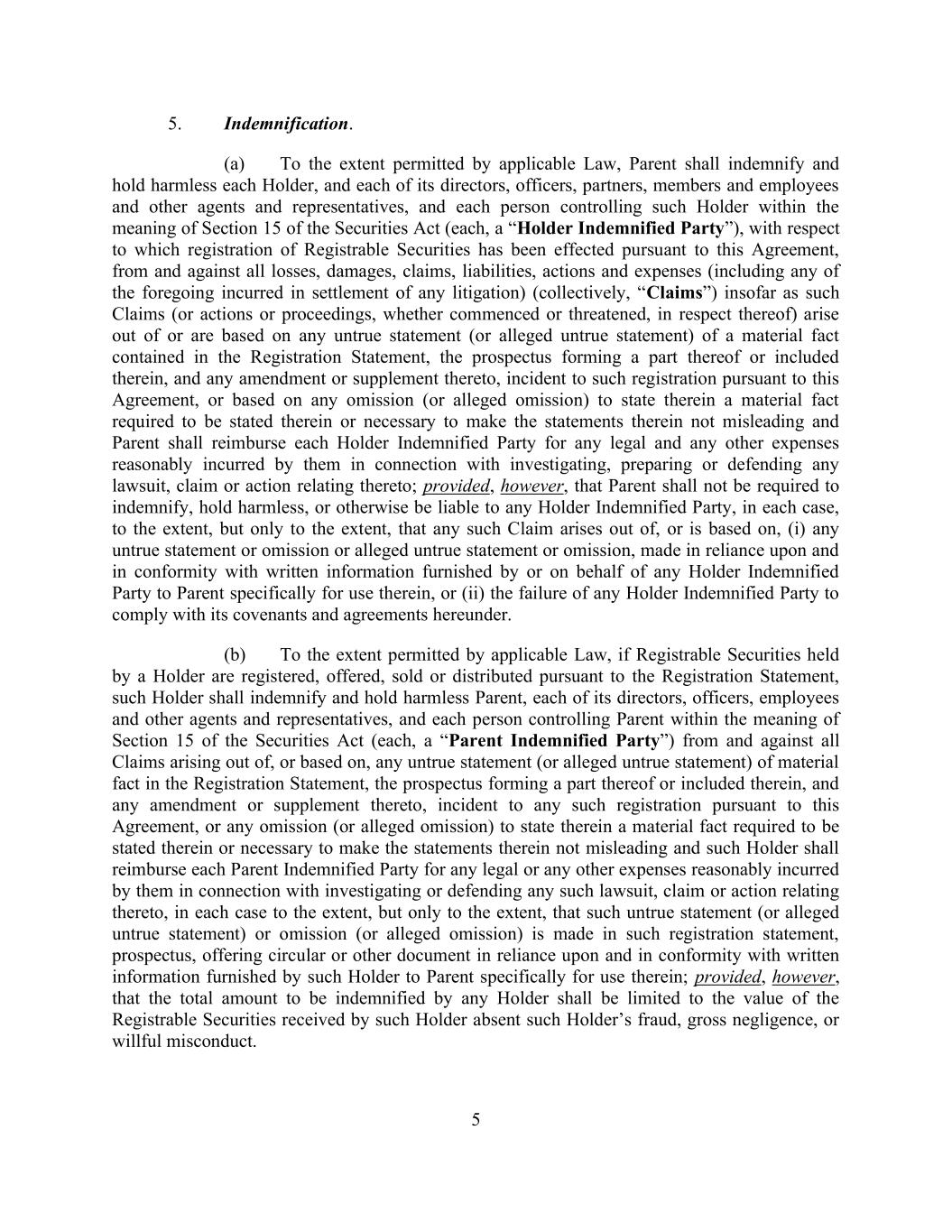 5 5. Indemnification. (a) To the extent permitted by applicable Law, Parent shall indemnify and hold harmless each Holder, and each of its directors, officers, partners, members and employees and other agents and representatives, and each person controlling such Holder within the meaning of Section 15 of the Securities Act (each, a “Holder Indemnified Party”), with respect to which registration of Registrable Securities has been effected pursuant to this Agreement, from and against all losses, damages, claims, liabilities, actions and expenses (including any of the foregoing incurred in settlement of any litigation) (collectively, “Claims”) insofar as such Claims (or actions or proceedings, whether commenced or threatened, in respect thereof) arise out of or are based on any untrue statement (or alleged untrue statement) of a material fact contained in the Registration Statement, the prospectus forming a part thereof or included therein, and any amendment or supplement thereto, incident to such registration pursuant to this Agreement, or based on any omission (or alleged omission) to state therein a material fact required to be stated therein or necessary to make the statements therein not misleading and Parent shall reimburse each Holder Indemnified Party for any legal and any other expenses reasonably incurred by them in connection with investigating, preparing or defending any lawsuit, claim or action relating thereto; provided, however, that Parent shall not be required to indemnify, hold harmless, or otherwise be liable to any Holder Indemnified Party, in each case, to the extent, but only to the extent, that any such Claim arises out of, or is based on, (i) any untrue statement or omission or alleged untrue statement or omission, made in reliance upon and in conformity with written information furnished by or on behalf of any Holder Indemnified Party to Parent specifically for use therein, or (ii) the failure of any Holder Indemnified Party to comply with its covenants and agreements hereunder. (b) To the extent permitted by applicable Law, if Registrable Securities held by a Holder are registered, offered, sold or distributed pursuant to the Registration Statement, such Holder shall indemnify and hold harmless Parent, each of its directors, officers, employees and other agents and representatives, and each person controlling Parent within the meaning of Section 15 of the Securities Act (each, a “Parent Indemnified Party”) from and against all Claims arising out of, or based on, any untrue statement (or alleged untrue statement) of material fact in the Registration Statement, the prospectus forming a part thereof or included therein, and any amendment or supplement thereto, incident to any such registration pursuant to this Agreement, or any omission (or alleged omission) to state therein a material fact required to be stated therein or necessary to make the statements therein not misleading and such Holder shall reimburse each Parent Indemnified Party for any legal or any other expenses reasonably incurred by them in connection with investigating or defending any such lawsuit, claim or action relating thereto, in each case to the extent, but only to the extent, that such untrue statement (or alleged untrue statement) or omission (or alleged omission) is made in such registration statement, prospectus, offering circular or other document in reliance upon and in conformity with written information furnished by such Holder to Parent specifically for use therein; provided, however, that the total amount to be indemnified by any Holder shall be limited to the value of the Registrable Securities received by such Holder absent such Holder’s fraud, gross negligence, or willful misconduct.