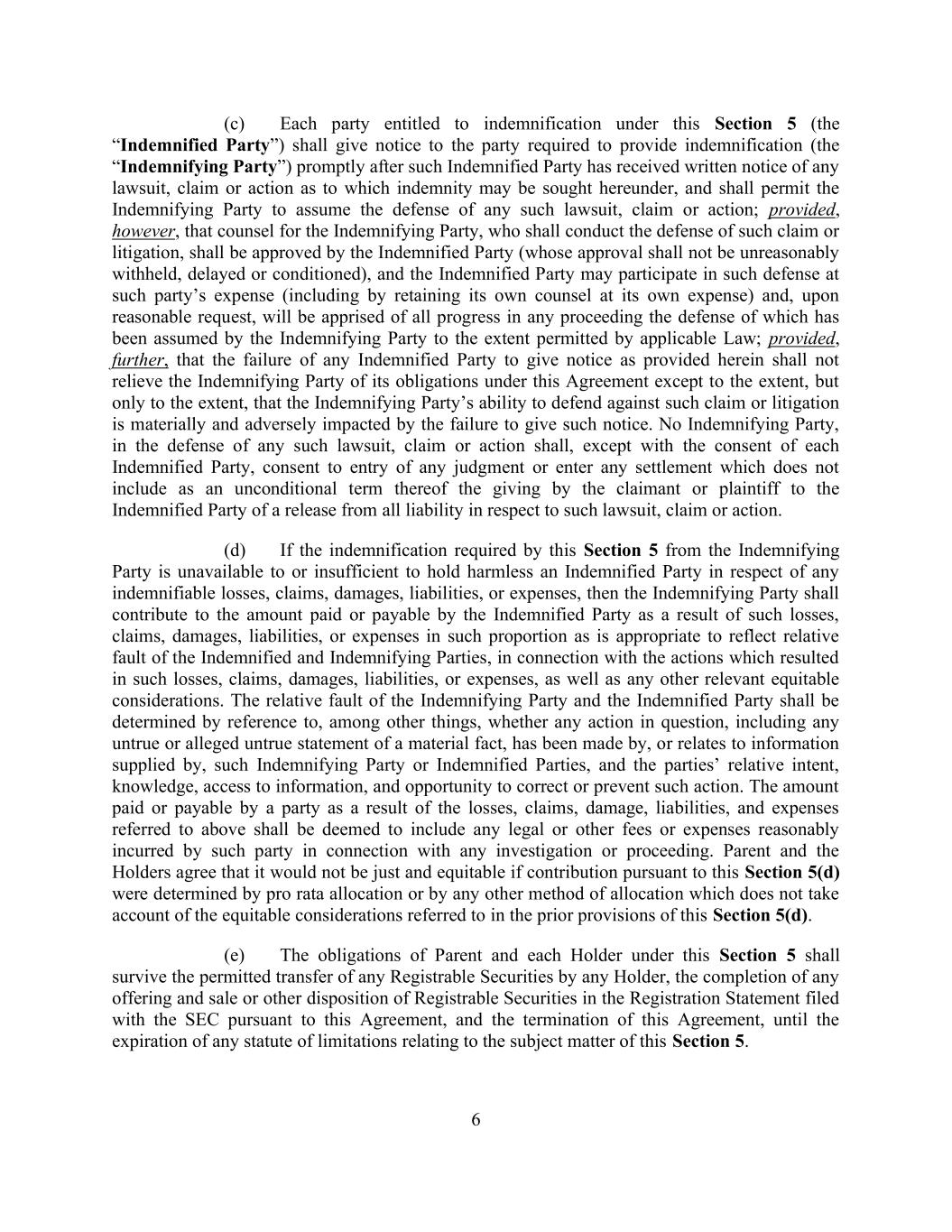 6 (c) Each party entitled to indemnification under this Section 5 (the “Indemnified Party”) shall give notice to the party required to provide indemnification (the “Indemnifying Party”) promptly after such Indemnified Party has received written notice of any lawsuit, claim or action as to which indemnity may be sought hereunder, and shall permit the Indemnifying Party to assume the defense of any such lawsuit, claim or action; provided, however, that counsel for the Indemnifying Party, who shall conduct the defense of such claim or litigation, shall be approved by the Indemnified Party (whose approval shall not be unreasonably withheld, delayed or conditioned), and the Indemnified Party may participate in such defense at such party’s expense (including by retaining its own counsel at its own expense) and, upon reasonable request, will be apprised of all progress in any proceeding the defense of which has been assumed by the Indemnifying Party to the extent permitted by applicable Law; provided, further, that the failure of any Indemnified Party to give notice as provided herein shall not relieve the Indemnifying Party of its obligations under this Agreement except to the extent, but only to the extent, that the Indemnifying Party’s ability to defend against such claim or litigation is materially and adversely impacted by the failure to give such notice. No Indemnifying Party, in the defense of any such lawsuit, claim or action shall, except with the consent of each Indemnified Party, consent to entry of any judgment or enter any settlement which does not include as an unconditional term thereof the giving by the claimant or plaintiff to the Indemnified Party of a release from all liability in respect to such lawsuit, claim or action. (d) If the indemnification required by this Section 5 from the Indemnifying Party is unavailable to or insufficient to hold harmless an Indemnified Party in respect of any indemnifiable losses, claims, damages, liabilities, or expenses, then the Indemnifying Party shall contribute to the amount paid or payable by the Indemnified Party as a result of such losses, claims, damages, liabilities, or expenses in such proportion as is appropriate to reflect relative fault of the Indemnified and Indemnifying Parties, in connection with the actions which resulted in such losses, claims, damages, liabilities, or expenses, as well as any other relevant equitable considerations. The relative fault of the Indemnifying Party and the Indemnified Party shall be determined by reference to, among other things, whether any action in question, including any untrue or alleged untrue statement of a material fact, has been made by, or relates to information supplied by, such Indemnifying Party or Indemnified Parties, and the parties’ relative intent, knowledge, access to information, and opportunity to correct or prevent such action. The amount paid or payable by a party as a result of the losses, claims, damage, liabilities, and expenses referred to above shall be deemed to include any legal or other fees or expenses reasonably incurred by such party in connection with any investigation or proceeding. Parent and the Holders agree that it would not be just and equitable if contribution pursuant to this Section 5(d) were determined by pro rata allocation or by any other method of allocation which does not take account of the equitable considerations referred to in the prior provisions of this Section 5(d). (e) The obligations of Parent and each Holder under this Section 5 shall survive the permitted transfer of any Registrable Securities by any Holder, the completion of any offering and sale or other disposition of Registrable Securities in the Registration Statement filed with the SEC pursuant to this Agreement, and the termination of this Agreement, until the expiration of any statute of limitations relating to the subject matter of this Section 5.