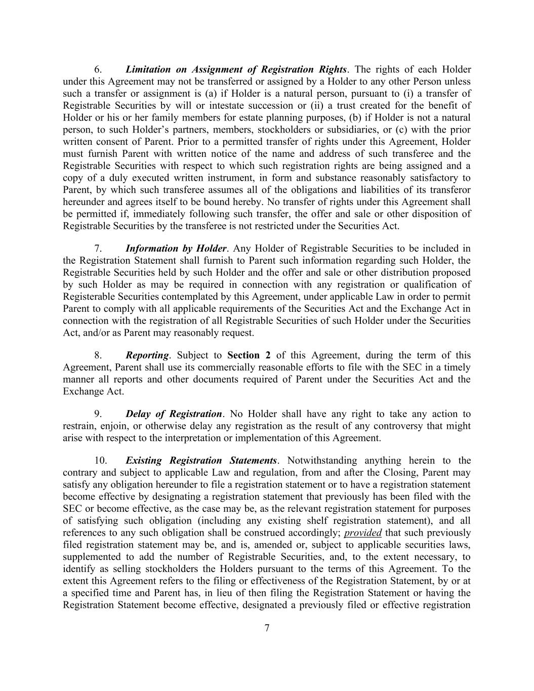 7 6. Limitation on Assignment of Registration Rights. The rights of each Holder under this Agreement may not be transferred or assigned by a Holder to any other Person unless such a transfer or assignment is (a) if Holder is a natural person, pursuant to (i) a transfer of Registrable Securities by will or intestate succession or (ii) a trust created for the benefit of Holder or his or her family members for estate planning purposes, (b) if Holder is not a natural person, to such Holder’s partners, members, stockholders or subsidiaries, or (c) with the prior written consent of Parent. Prior to a permitted transfer of rights under this Agreement, Holder must furnish Parent with written notice of the name and address of such transferee and the Registrable Securities with respect to which such registration rights are being assigned and a copy of a duly executed written instrument, in form and substance reasonably satisfactory to Parent, by which such transferee assumes all of the obligations and liabilities of its transferor hereunder and agrees itself to be bound hereby. No transfer of rights under this Agreement shall be permitted if, immediately following such transfer, the offer and sale or other disposition of Registrable Securities by the transferee is not restricted under the Securities Act. 7. Information by Holder. Any Holder of Registrable Securities to be included in the Registration Statement shall furnish to Parent such information regarding such Holder, the Registrable Securities held by such Holder and the offer and sale or other distribution proposed by such Holder as may be required in connection with any registration or qualification of Registerable Securities contemplated by this Agreement, under applicable Law in order to permit Parent to comply with all applicable requirements of the Securities Act and the Exchange Act in connection with the registration of all Registrable Securities of such Holder under the Securities Act, and/or as Parent may reasonably request. 8. Reporting. Subject to Section 2 of this Agreement, during the term of this Agreement, Parent shall use its commercially reasonable efforts to file with the SEC in a timely manner all reports and other documents required of Parent under the Securities Act and the Exchange Act. 9. Delay of Registration. No Holder shall have any right to take any action to restrain, enjoin, or otherwise delay any registration as the result of any controversy that might arise with respect to the interpretation or implementation of this Agreement. 10. Existing Registration Statements. Notwithstanding anything herein to the contrary and subject to applicable Law and regulation, from and after the Closing, Parent may satisfy any obligation hereunder to file a registration statement or to have a registration statement become effective by designating a registration statement that previously has been filed with the SEC or become effective, as the case may be, as the relevant registration statement for purposes of satisfying such obligation (including any existing shelf registration statement), and all references to any such obligation shall be construed accordingly; provided that such previously filed registration statement may be, and is, amended or, subject to applicable securities laws, supplemented to add the number of Registrable Securities, and, to the extent necessary, to identify as selling stockholders the Holders pursuant to the terms of this Agreement. To the extent this Agreement refers to the filing or effectiveness of the Registration Statement, by or at a specified time and Parent has, in lieu of then filing the Registration Statement or having the Registration Statement become effective, designated a previously filed or effective registration
