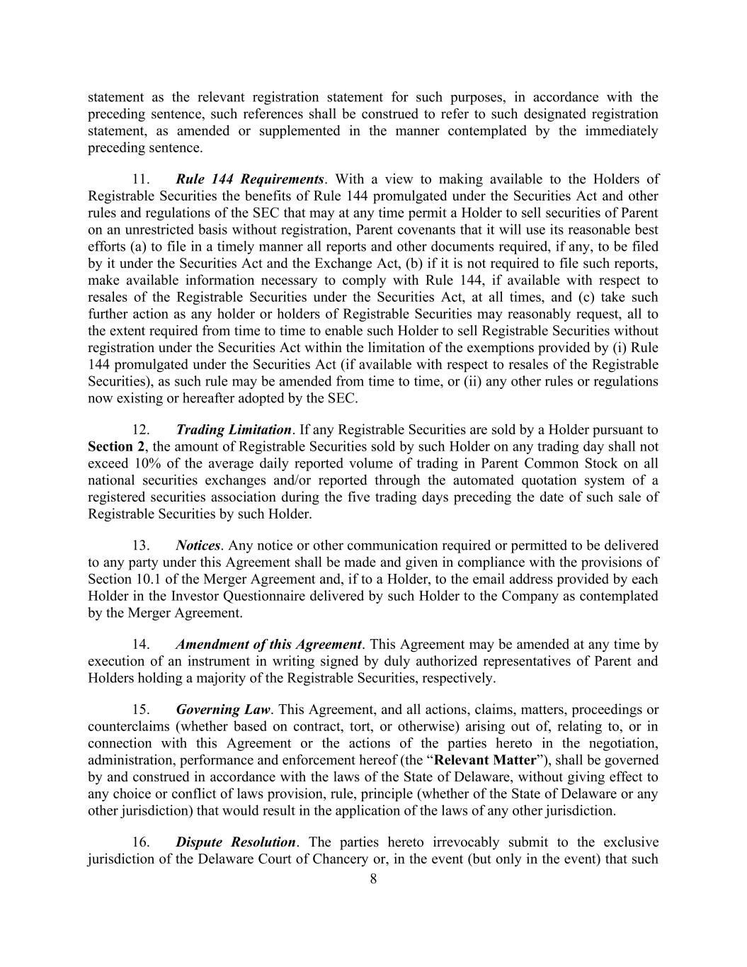 8 statement as the relevant registration statement for such purposes, in accordance with the preceding sentence, such references shall be construed to refer to such designated registration statement, as amended or supplemented in the manner contemplated by the immediately preceding sentence. 11. Rule 144 Requirements. With a view to making available to the Holders of Registrable Securities the benefits of Rule 144 promulgated under the Securities Act and other rules and regulations of the SEC that may at any time permit a Holder to sell securities of Parent on an unrestricted basis without registration, Parent covenants that it will use its reasonable best efforts (a) to file in a timely manner all reports and other documents required, if any, to be filed by it under the Securities Act and the Exchange Act, (b) if it is not required to file such reports, make available information necessary to comply with Rule 144, if available with respect to resales of the Registrable Securities under the Securities Act, at all times, and (c) take such further action as any holder or holders of Registrable Securities may reasonably request, all to the extent required from time to time to enable such Holder to sell Registrable Securities without registration under the Securities Act within the limitation of the exemptions provided by (i) Rule 144 promulgated under the Securities Act (if available with respect to resales of the Registrable Securities), as such rule may be amended from time to time, or (ii) any other rules or regulations now existing or hereafter adopted by the SEC. 12. Trading Limitation. If any Registrable Securities are sold by a Holder pursuant to Section 2, the amount of Registrable Securities sold by such Holder on any trading day shall not exceed 10% of the average daily reported volume of trading in Parent Common Stock on all national securities exchanges and/or reported through the automated quotation system of a registered securities association during the five trading days preceding the date of such sale of Registrable Securities by such Holder. 13. Notices. Any notice or other communication required or permitted to be delivered to any party under this Agreement shall be made and given in compliance with the provisions of Section 10.1 of the Merger Agreement and, if to a Holder, to the email address provided by each Holder in the Investor Questionnaire delivered by such Holder to the Company as contemplated by the Merger Agreement. 14. Amendment of this Agreement. This Agreement may be amended at any time by execution of an instrument in writing signed by duly authorized representatives of Parent and Holders holding a majority of the Registrable Securities, respectively. 15. Governing Law. This Agreement, and all actions, claims, matters, proceedings or counterclaims (whether based on contract, tort, or otherwise) arising out of, relating to, or in connection with this Agreement or the actions of the parties hereto in the negotiation, administration, performance and enforcement hereof (the “Relevant Matter”), shall be governed by and construed in accordance with the laws of the State of Delaware, without giving effect to any choice or conflict of laws provision, rule, principle (whether of the State of Delaware or any other jurisdiction) that would result in the application of the laws of any other jurisdiction. 16. Dispute Resolution. The parties hereto irrevocably submit to the exclusive jurisdiction of the Delaware Court of Chancery or, in the event (but only in the event) that such
