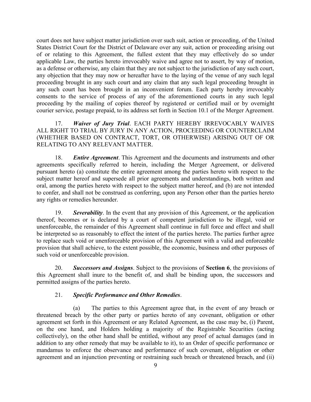 9 court does not have subject matter jurisdiction over such suit, action or proceeding, of the United States District Court for the District of Delaware over any suit, action or proceeding arising out of or relating to this Agreement, the fullest extent that they may effectively do so under applicable Law, the parties hereto irrevocably waive and agree not to assert, by way of motion, as a defense or otherwise, any claim that they are not subject to the jurisdiction of any such court, any objection that they may now or hereafter have to the laying of the venue of any such legal proceeding brought in any such court and any claim that any such legal proceeding brought in any such court has been brought in an inconvenient forum. Each party hereby irrevocably consents to the service of process of any of the aforementioned courts in any such legal proceeding by the mailing of copies thereof by registered or certified mail or by overnight courier service, postage prepaid, to its address set forth in Section 10.1 of the Merger Agreement. 17. Waiver of Jury Trial. EACH PARTY HEREBY IRREVOCABLY WAIVES ALL RIGHT TO TRIAL BY JURY IN ANY ACTION, PROCEEDING OR COUNTERCLAIM (WHETHER BASED ON CONTRACT, TORT, OR OTHERWISE) ARISING OUT OF OR RELATING TO ANY RELEVANT MATTER. 18. Entire Agreement. This Agreement and the documents and instruments and other agreements specifically referred to herein, including the Merger Agreement, or delivered pursuant hereto (a) constitute the entire agreement among the parties hereto with respect to the subject matter hereof and supersede all prior agreements and understandings, both written and oral, among the parties hereto with respect to the subject matter hereof, and (b) are not intended to confer, and shall not be construed as conferring, upon any Person other than the parties hereto any rights or remedies hereunder. 19. Severability. In the event that any provision of this Agreement, or the application thereof, becomes or is declared by a court of competent jurisdiction to be illegal, void or unenforceable, the remainder of this Agreement shall continue in full force and effect and shall be interpreted so as reasonably to effect the intent of the parties hereto. The parties further agree to replace such void or unenforceable provision of this Agreement with a valid and enforceable provision that shall achieve, to the extent possible, the economic, business and other purposes of such void or unenforceable provision. 20. Successors and Assigns. Subject to the provisions of Section 6, the provisions of this Agreement shall inure to the benefit of, and shall be binding upon, the successors and permitted assigns of the parties hereto. 21. Specific Performance and Other Remedies. (a) The parties to this Agreement agree that, in the event of any breach or threatened breach by the other party or parties hereto of any covenant, obligation or other agreement set forth in this Agreement or any Related Agreement, as the case may be, (i) Parent, on the one hand, and Holders holding a majority of the Registrable Securities (acting collectively), on the other hand shall be entitled, without any proof of actual damages (and in addition to any other remedy that may be available to it), to an Order of specific performance or mandamus to enforce the observance and performance of such covenant, obligation or other agreement and an injunction preventing or restraining such breach or threatened breach, and (ii)