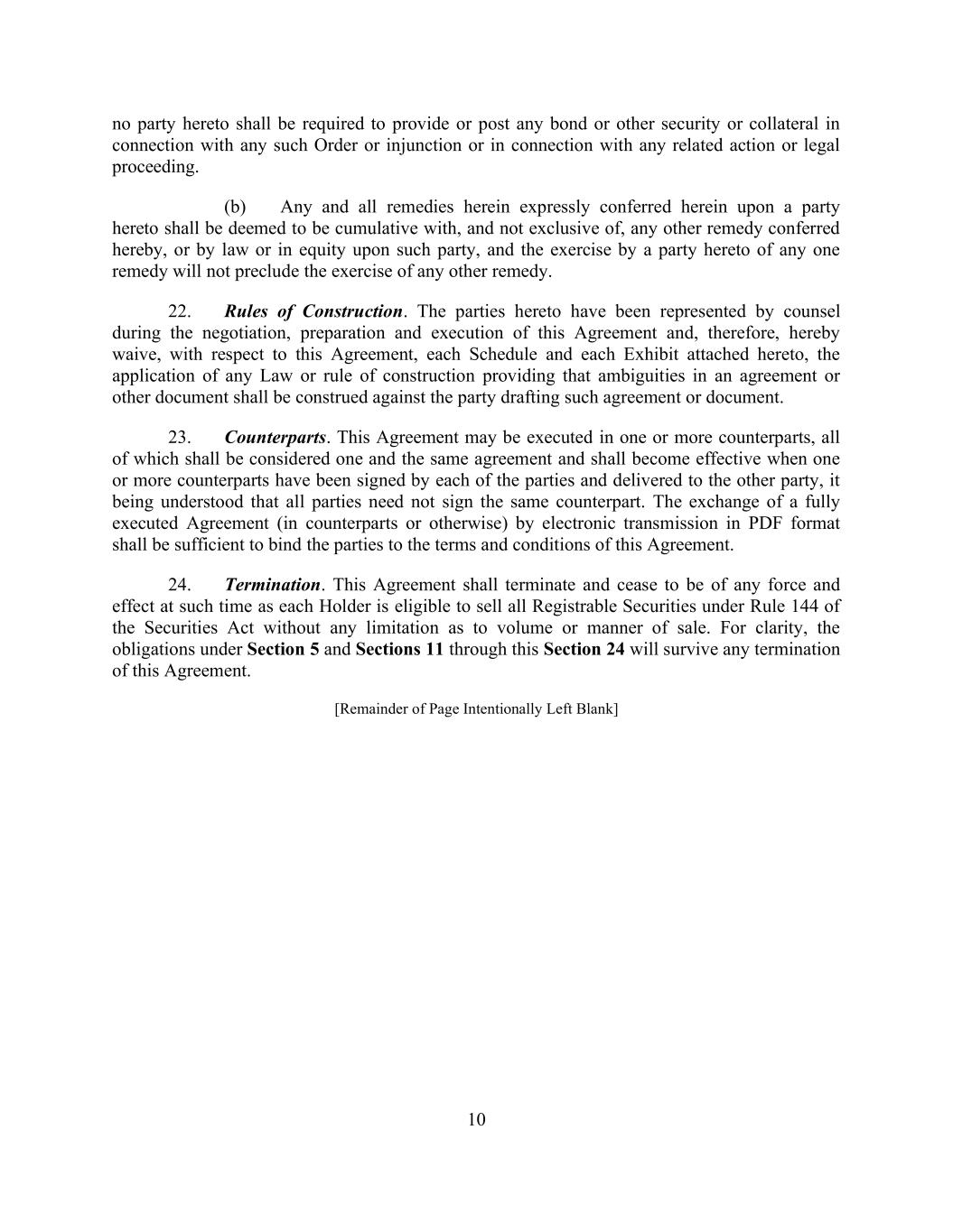 10 no party hereto shall be required to provide or post any bond or other security or collateral in connection with any such Order or injunction or in connection with any related action or legal proceeding. (b) Any and all remedies herein expressly conferred herein upon a party hereto shall be deemed to be cumulative with, and not exclusive of, any other remedy conferred hereby, or by law or in equity upon such party, and the exercise by a party hereto of any one remedy will not preclude the exercise of any other remedy. 22. Rules of Construction. The parties hereto have been represented by counsel during the negotiation, preparation and execution of this Agreement and, therefore, hereby waive, with respect to this Agreement, each Schedule and each Exhibit attached hereto, the application of any Law or rule of construction providing that ambiguities in an agreement or other document shall be construed against the party drafting such agreement or document. 23. Counterparts. This Agreement may be executed in one or more counterparts, all of which shall be considered one and the same agreement and shall become effective when one or more counterparts have been signed by each of the parties and delivered to the other party, it being understood that all parties need not sign the same counterpart. The exchange of a fully executed Agreement (in counterparts or otherwise) by electronic transmission in PDF format shall be sufficient to bind the parties to the terms and conditions of this Agreement. 24. Termination. This Agreement shall terminate and cease to be of any force and effect at such time as each Holder is eligible to sell all Registrable Securities under Rule 144 of the Securities Act without any limitation as to volume or manner of sale. For clarity, the obligations under Section 5 and Sections 11 through this Section 24 will survive any termination of this Agreement. [Remainder of Page Intentionally Left Blank]