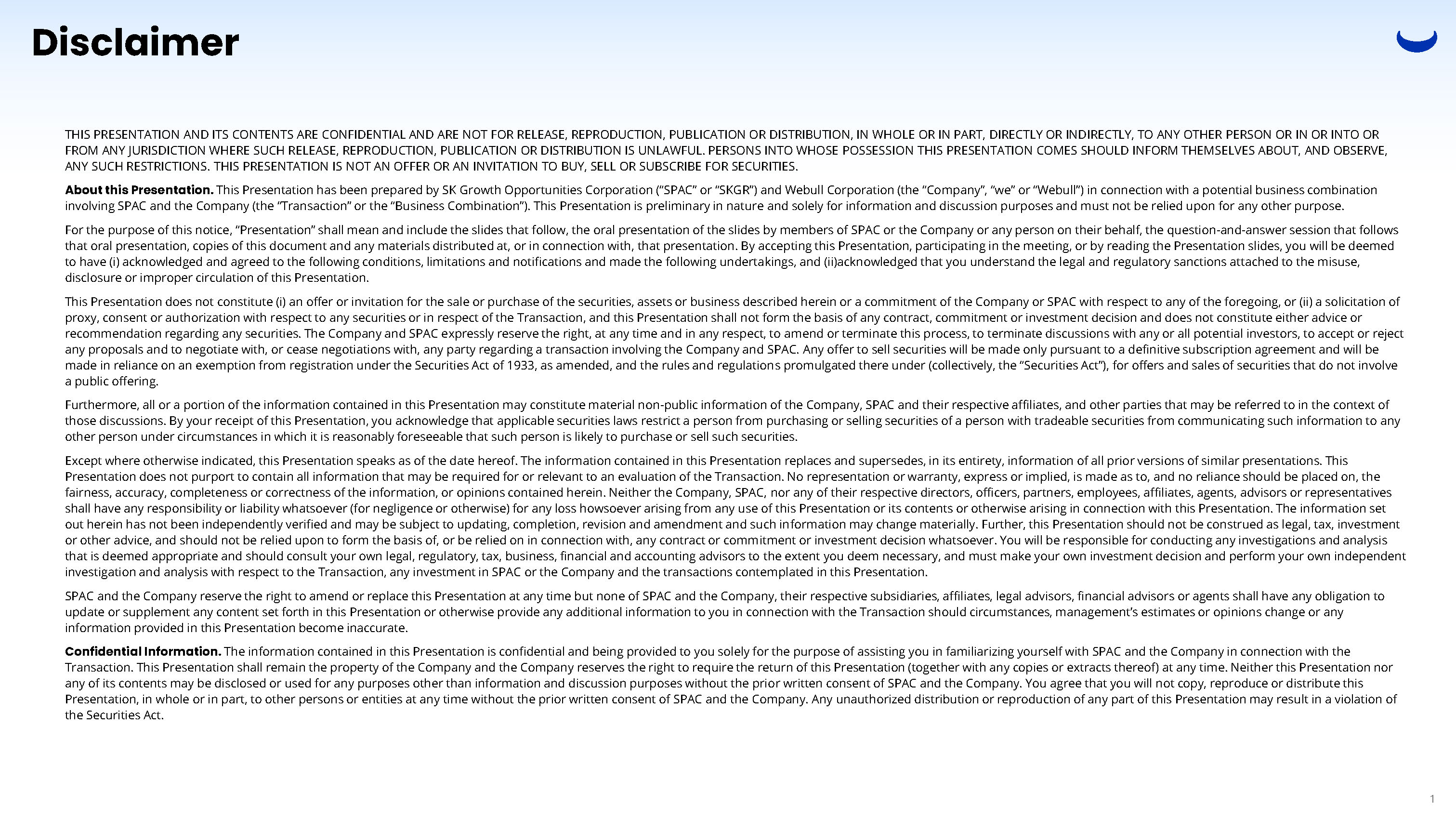 Disclaimer 1 THIS PRESENTATION AND ITS CONTENTS ARE CONFIDENTIAL AND ARE NOT FOR RELEASE, REPRODUCTION, PUBLICATION OR DISTRIBUTION, IN WHOLE OR IN PART, DIRECTLY OR INDIRECTLY, TO ANY OTHER PERSON OR IN OR INTO OR FROM ANY JURISDICTION WHERE SUCH RELEASE, REPRODUCTION, PUBLICATION OR DISTRIBUTION IS UNLAWFUL. PERSONS INTO WHOSE POSSESSION THIS PRESENTATION COMES SHOULD INFORM THEMSELVES ABOUT, AND OBSERVE, ANY SUCH RESTRICTIONS. THIS PRESENTATION IS NOT AN OFFER OR AN INVITATION TO BUY, SELL OR SUBSCRIBE FOR SECURITIES. About this Presentation. This Presentation has been prepared by SK Growth Opportunities Corporation (“SPAC” or “SKGR”) and Webull Corporation (the “Company”, “we” or “Webull”) in connection with a potential business combination involving SPAC and the Company (the “Transaction” or the “Business Combination”). This Presentation is preliminary in nature and solely for information and discussion purposes and must not be relied upon for any other purpose. For the purpose of this notice, “Presentation” shall mean and include the slides that follow, the oral presentation of the slides by members of SPAC or the Company or any person on their behalf, the question - and - answer session that follows that oral presentation, copies of this document and any materials distributed at, or in connection with, that presentation. By accepting this Presentation, participating in the meeting, or by reading the Presentation slides, you will be deemed to have (i) acknowledged and agreed to the following conditions, limitations and notifications and made the following undertakings, and (ii)acknowledged that you understand the legal and regulatory sanctions attached to the misuse, disclosure or improper circulation of this Presentation. This Presentation does not constitute (i) an offer or invitation for the sale or purchase of the securities, assets or business described herein or a commitment of the Company or SPAC with respect to any of the foregoing, or (ii) a solicitation of proxy, consent or authorization with respect to any securities or in respect of the Transaction, and this Presentation shall not form the basis of any contract, commitment or investment decision and does not constitute either advice or recommendation regarding any securities. The Company and SPAC expressly reserve the right, at any time and in any respect, to amend or terminate this process, to terminate discussions with any or all potential investors, to accept or reject any proposals and to negotiate with, or cease negotiations with, any party regarding a transaction involving the Company and SPAC. Any offer to sell securities will be made only pursuant to a definitive subscription agreement and will be made in reliance on an exemption from registration under the Securities Act of 1933, as amended, and the rules and regulations promulgated there under (collectively, the “Securities Act”), for offers and sales of securities that do not involve a public offering. Furthermore, all or a portion of the information contained in this Presentation may constitute material non - public information of the Company, SPAC and their respective affiliates, and other parties that may be referred to in the context of those discussions. By your receipt of this Presentation, you acknowledge that applicable securities laws restrict a person from purchasing or selling securities of a person with tradeable securities from communicating such information to any other person under circumstances in which it is reasonably foreseeable that such person is likely to purchase or sell such securities. Except where otherwise indicated, this Presentation speaks as of the date hereof. The information contained in this Presentation replaces and supersedes, in its entirety, information of all prior versions of similar presentations. This Presentation does not purport to contain all information that may be required for or relevant to an evaluation of the Transaction. No representation or warranty, express or implied, is made as to, and no reliance should be placed on, the fairness, accuracy, completeness or correctness of the information, or opinions contained herein. Neither the Company, SPAC, nor any of their respective directors, officers, partners, employees, affiliates, agents, advisors or representatives shall have any responsibility or liability whatsoever (for negligence or otherwise) for any loss howsoever arising from any use of this Presentation or its contents or otherwise arising in connection with this Presentation. The information set out herein has not been independently verified and may be subject to updating, completion, revision and amendment and such information may change materially. Further, this Presentation should not be construed as legal, tax, investment or other advice, and should not be relied upon to form the basis of, or be relied on in connection with, any contract or commitment or investment decision whatsoever. You will be responsible for conducting any investigations and analysis that is deemed appropriate and should consult your own legal, regulatory, tax, business, financial and accounting advisors to the extent you deem necessary, and must make your own investment decision and perform your own independent investigation and analysis with respect to the Transaction, any investment in SPAC or the Company and the transactions contemplated in this Presentation. SPAC and the Company reserve the right to amend or replace this Presentation at any time but none of SPAC and the Company, their respective subsidiaries, affiliates, legal advisors, financial advisors or agents shall have any obligation to update or supplement any content set forth in this Presentation or otherwise provide any additional information to you in connection with the Transaction should circumstances, management’s estimates or opinions change or any information provided in this Presentation become inaccurate. Confidenti