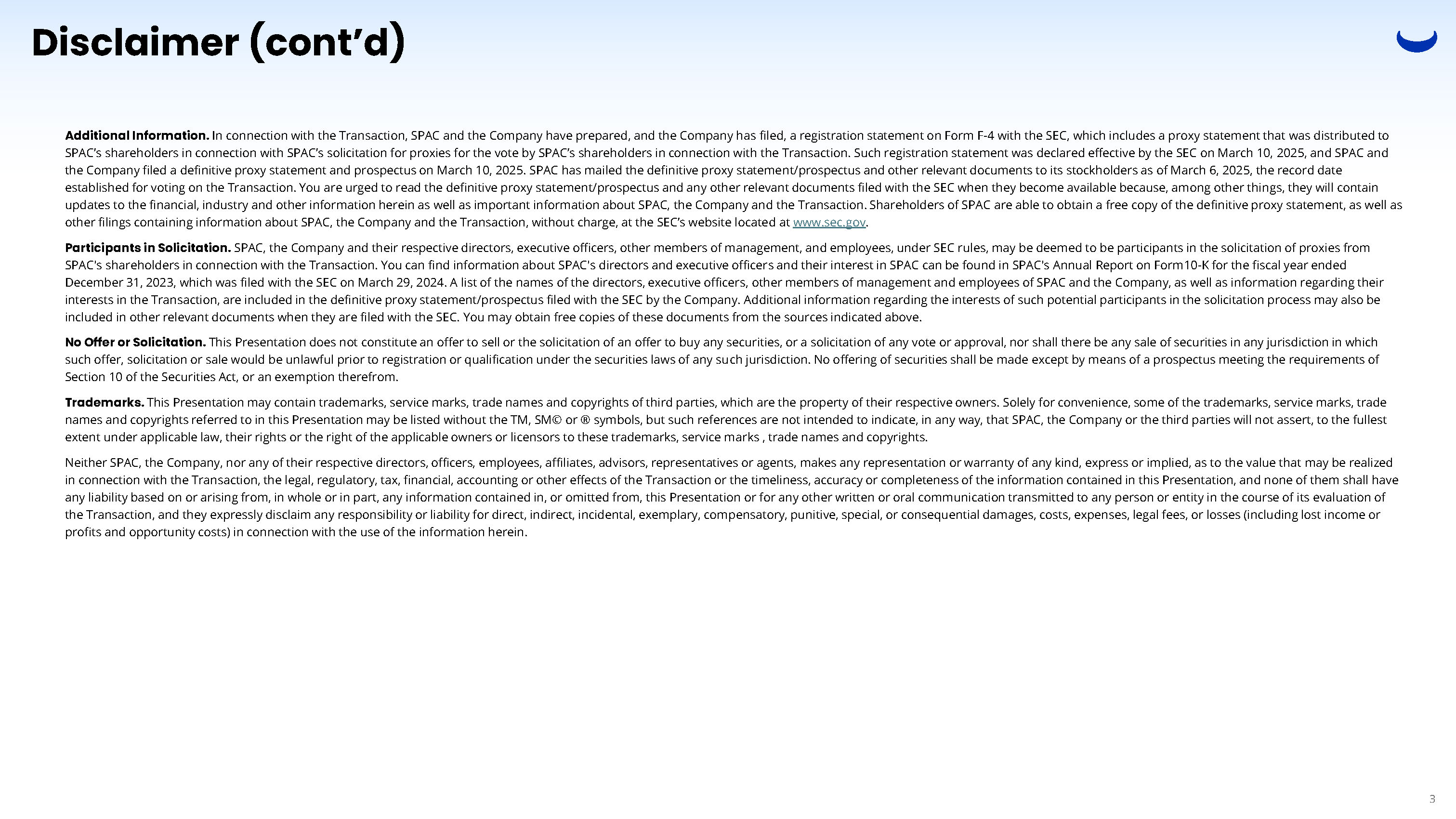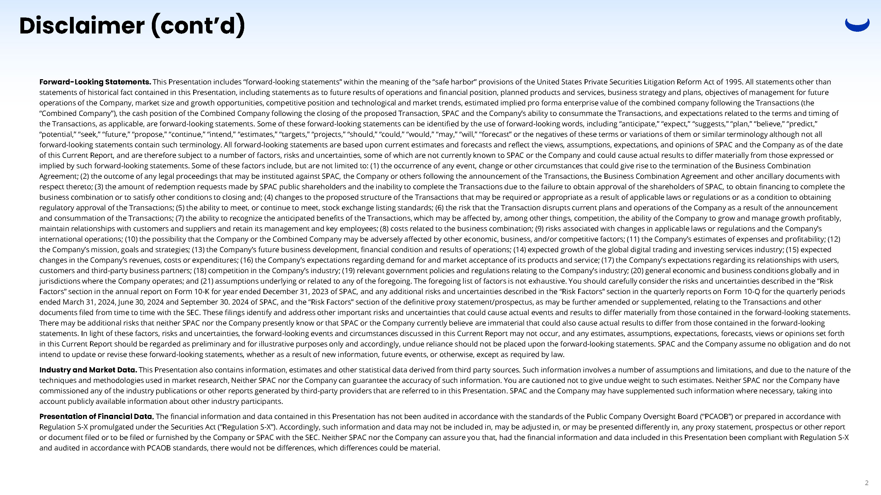 Disclaimer (cont’d) 2 Forward - Looking Statements. Certain statements included in this Presentation are forward - looking statements. All statements other than statements of historical fact contained in this Presentation, including statements as to future results of operations and financial position, planned products and services, business strategy and plans, objectives of management for future operations of the Company, market size and growth opportunities, competitive position and technological and market trends, are forward - looking statements. Some of these forward - looking statements can be identified by the use of forward - looking words, including “anticipate,” “expect,” “suggests,” “plan,” “believe,” “intend,” “estimates,” “targets,” “projects,” “should,” “could,” “would,” “may,” “will,” “forecast” or other similar expressions. All forward - looking statements are based upon current estimates and forecasts and reflect the views, assumptions, expectations, and opinions of SPAC and the Company as of the date of this Presentation, and are therefore subject to a number of factors, risks and uncertainties, some of which are not currently known to SPAC or the Company. Some of these factors include, but are not limited to: Webull’s mission, goals and strategies, Webull’s future business development, financial condition and results of operations, expected growth of the global digital trading and investing services industry, expected changes in Webull’s revenues, costs or expenditures, Webull’s expectations regarding demand for and market acceptance of Webull’s products and service, Webull’s expectations regarding its relationships with users, customers and third - party business partners, competition in Webull’s industry, relevant government policies and regulations relating to Webull’s industry, general economic and business conditions globally and in jurisdictions where Webull operates, and assumptions underlying or related to any of the foregoing. The foregoing list of factors is not exhaustive. You should carefully consider the risks and uncertainties described in the “Risk Factors” section of this Presentation, the “Risk Factors” section in the annual report on Form 10 - K for year ended December 31, 2023 of SPAC, and the “Risk Factors” section of the proxy statement/prospectus on Form F - 4 relating to the Transaction which is expected to be filed with the U.S. Securities and Exchange Commission (“SEC”), and other documents filed from time to time with the SEC. These filings identify and address other important risks and uncertainties that could cause actual events and results to differ materially from those contained in the forward - looking statements. In light of these factors, risks and uncertainties, the forward - looking events and circumstances discussed in this Presentation may not occur, and any estimates, assumptions, expectations, forecasts, views or opinions set forth in this Presentation should be regarded as preliminary and for illustrative purposes only and accordingly, undue reliance should not be placed upon the forward - looking statements. SPAC and the Company assume no obligation and do not intend to update or revise these forward - looking statements, whether as a result of new information, future events, or otherwise, except as required by law. Moreover, the Company operates in a very competitive and rapidly changing environment, and new risks may emerge from time to time. It is not possible to predict all risks, nor assess the impact of all factors on the Company’s business or the extent to which any factor, or combination of factors, may cause the Company’s actual results, performance or financial condition to be materially different from the expected future results, performance of financial condition. In addition, the analyses of SPAC and the Company contained herein are not, and do not purport to be, appraisals of the securities, assets or business of the Company, SPAC or any other entity. There may be additional risks that neither SPAC nor the Company presently knows or that SPAC and the Company currently believe are immaterial that could also cause actual results to differ from those contained in the forward - looking statements. These forward - looking statements should not be relied upon as representing the Company’s or SPAC’s assessment as of any date subsequent to the date of this Presentation. More generally, SPAC and the Company caution you against relying on these forward - looking statements, and SPAC and the Company qualify all of our forward - looking statements by these cautionary statements. Industry and Market Data. This Presentation also contains information, estimates and other statistical data derived from third party sources. Such information involves a number of assumptions and limitations, and due to the nature of the techniques and methodologies used in market research, Neither SPAC nor the Company can guarantee the accuracy of such information. You are cautioned not to give undue weight to such estimates. Neither SPAC nor the Company have commissioned any of the industry publications or other reports generated by third - party providers that are referred to in this Presentation. SPAC and the Company may have supplemented such information where necessary, taking into account publicly available information about other industry participants. Presentation of Financial Data . The financial information and data contained in this Presentation has not been audited in accordance with the standards of the Public Company Oversight Board (“PCAOB”) or prepared in accordance with Regulation S - X promulgated under the Securities Act (“Regulation S - X”). Accordingly, such information and data may not be included in, may be adjusted in, or may be presented differently in, any proxy statement, prospectus or other report or document filed 