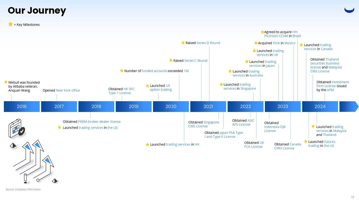 Launched US option trading Opened New York office Webull was founded by Alibaba veteran, Anquan Wang = Key Milestones Launched trading services in HK Raised Series C Round Obtained Singapore CMS License Obtained Japan FSA Type I and Type II License Obtained ASIC AFS License Launched trading services in Singapore Obtained UK FCA License Number of funded accounts exceeded 1M Raised Series D Round Launched trading services in UK Launched trading services in Japan Launched trading services in Australia Obtained Indonesia OJK License Agreed to acquire HH Picchioni CCVM in Brazil Acquired Flink in Mexico Obtained Canada CIRO License Our Journey 2016 2017 2018 Obtained FINRA broker - dealer license Launched trading services in the US 2020 2019 2021 2022 2023 Obtained HK SFC Type 1 License 2024 Launched trading services in Canada Launched futures trading in the US Obtained Thailand securities business license and Malaysia CMS License Launched trading services in Malaysia and Thailand Obtained Investment Source: Company Information 10 Firm License issued by the AFM
