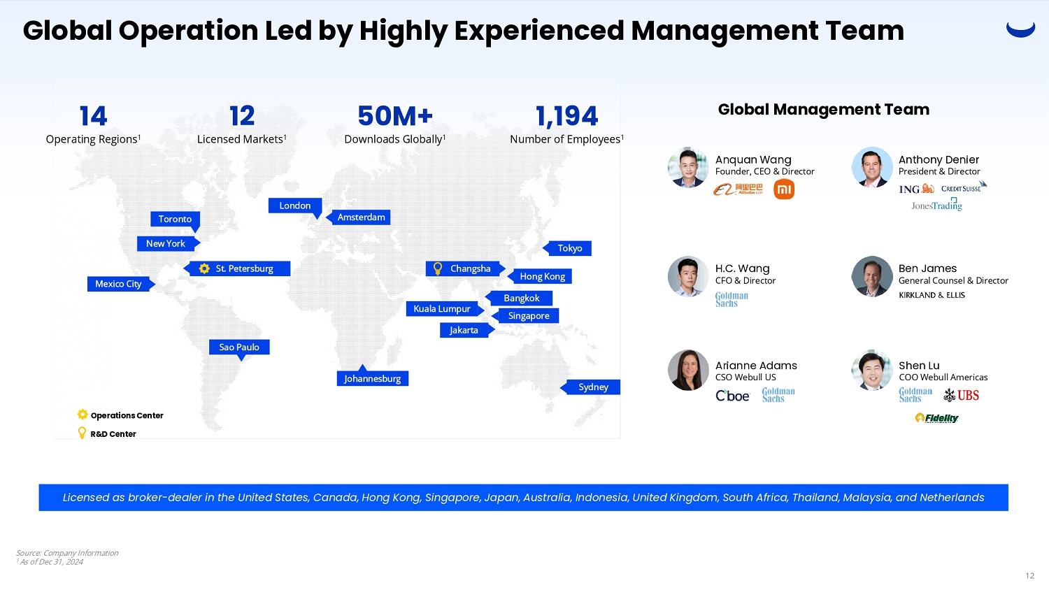 Webull Today 11 = Year - over - Year Growth Source: Company Information 1 As of Dec 31, 2024 2 For full year 2024 3 Daily Average Revenue Trades (“DARTs”) measures the number of customer trades executed during a given period divided by the number of trading days in that period (assuming 252 trading days for 2024) 4 As of Q4 2024. Retention rate is defined as 1 - churn rate, which refers to the ratio of churned accounts during the current quarter to the number of funded accounts at the end of the preceding quarter + new funded accounts acquired during the current quarter Cumulative registered users 1 98% Quarterly retention rate for funded accounts 4 693K DARTs 3 $460B Equity Notional Volumes 2 461M Options Contracts Traded 2 50M+ Downloads Globally 1 +18% 23.3M +9% 4.7M Funded Accounts 1 +66% $13.6B Customer Assets 1