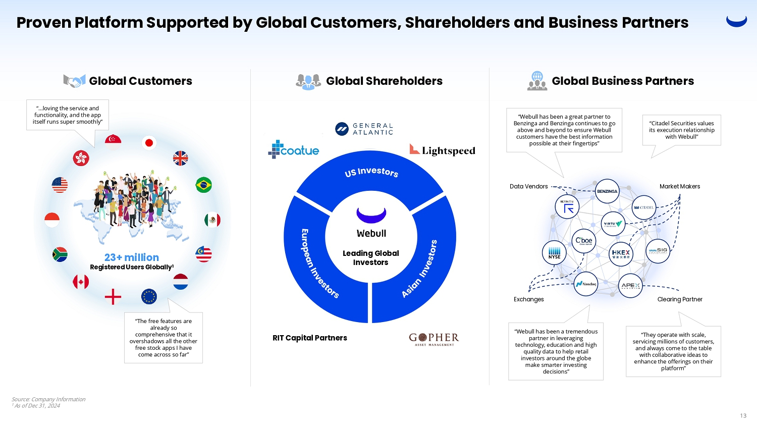 Global Operation Led by Highly Experienced Management Team Shen Lu COO Webull Americas Global Management Team Tokyo Bangkok Jakarta Sydney Johannesburg London Kuala Lumpur Hong Kong Singapore New York Sao Paulo Mexico City Toronto Anquan Wang Founder, CEO & Director Anthony Denier President & Director Ben James General Counsel & Director H.C. Wang CFO & Director Arianne Adams CSO Webull US Operations Center R&D Center Changsha St. Petersburg Licensed as broker - dealer in the United States, Canada, Hong Kong, Singapore, Japan, Australia, Indonesia, United Kingdom, South Africa, Thailand, Malaysia, and Netherlands 14 Operating Regions 1 12 Licensed Markets 1 50M+ Downloads Globally 1 1,194 Number of Employees 1 Amsterdam Source: Company Information 1 As of Dec 31, 2024 12
