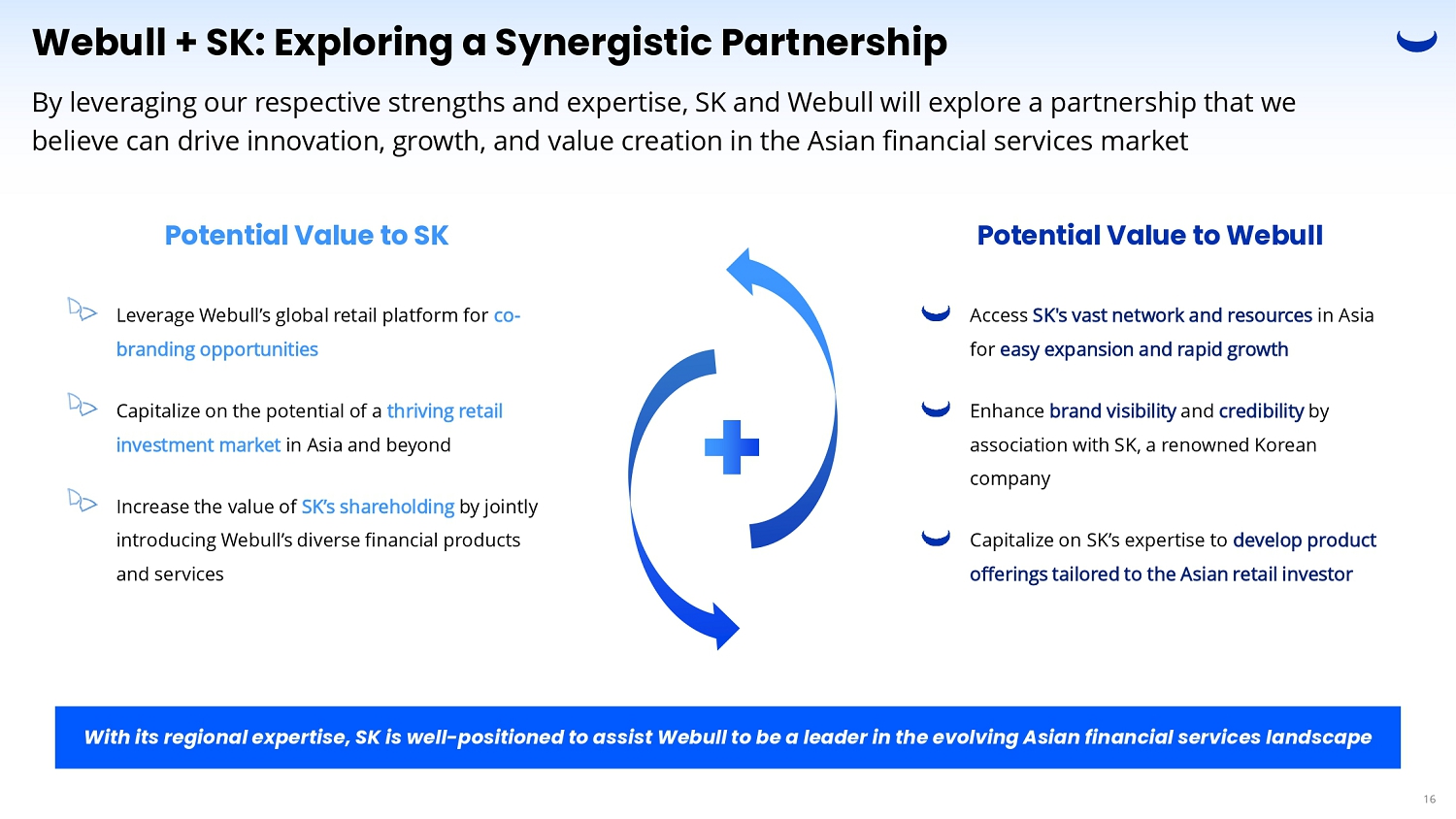 Webull + SK: Exploring a Synergistic Partnership Potential Value to SK Potential Value to Webull Leverage Webull’s global retail platform for co - branding opportunities Capitalize on the potential of a thriving retail investment market in Asia and beyond Increase the value of SK’s shareholding by jointly introducing Webull’s diverse financial products and services Access SK's vast network and resources in Asia for easy expansion and rapid growth Enhance brand visibility and credibility by association with SK, a renowned Korean company Capitalize on SK’s expertise to develop product offerings tailored to the Asian retail investor 16 By leveraging our respective strengths and expertise, SK and Webull will explore a partnership that we believe can drive innovation, growth, and value creation in the Asian financial services market With its regional expertise, SK is well - positioned to assist Webull to be a leader in the evolving Asian financial services landscape