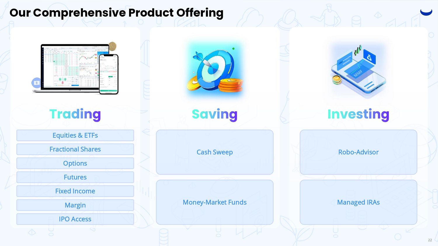 Our Comprehensive Product Offering Equities & ETFs Fractional Shares Options Futures Fixed Income Margin IPO Access Cash Sweep Money - Market Funds Robo - Advisor Managed IRAs 22