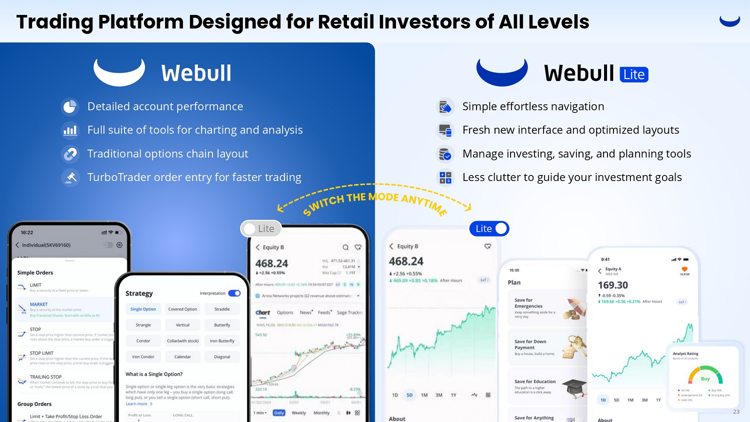 Trading Platform Designed for Retail Investors of All Levels Simple effortless navigation Fresh new interface and optimized layouts Manage investing, saving, and planning tools Less clutter to guide your investment goals Lite Lite Detailed account performance Full suite of tools for charting and analysis Traditional options chain layout TurboTrader order entry for faster trading 23